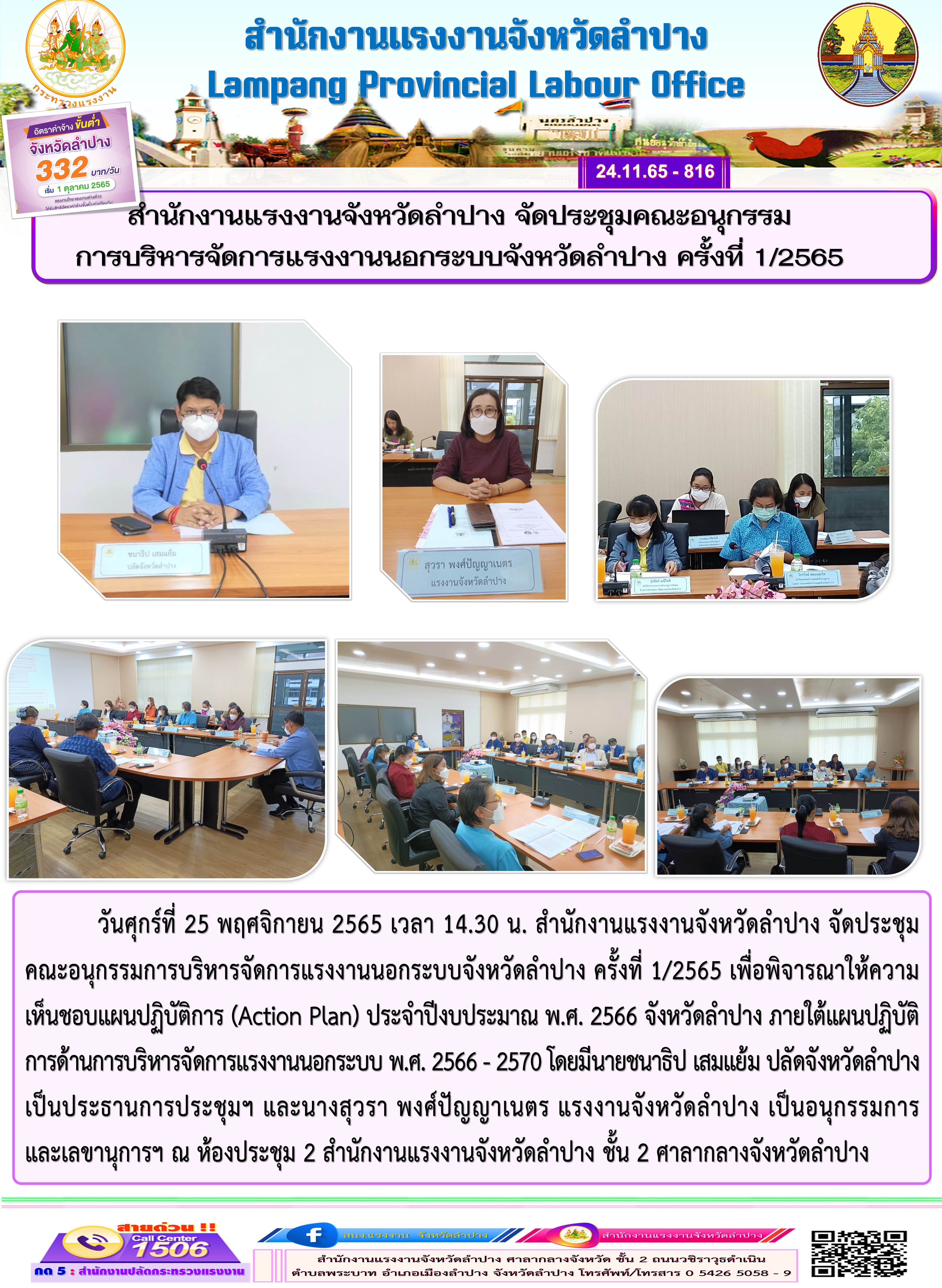 สำนักงานแรงงานจังหวัดลำปาง จัดประชุมคณะอนุกรรมการบริหารจัดการแรงงานนอกระบบจังหวัดลำปาง ครั้งที่ 1/2565 เพื่อพิจารณาให้ความเห็นชอบแผนปฏิบัติการ (Action Plan) ประจำปีงบประมาณ พ.ศ. 2566 จังหวัดลำปาง