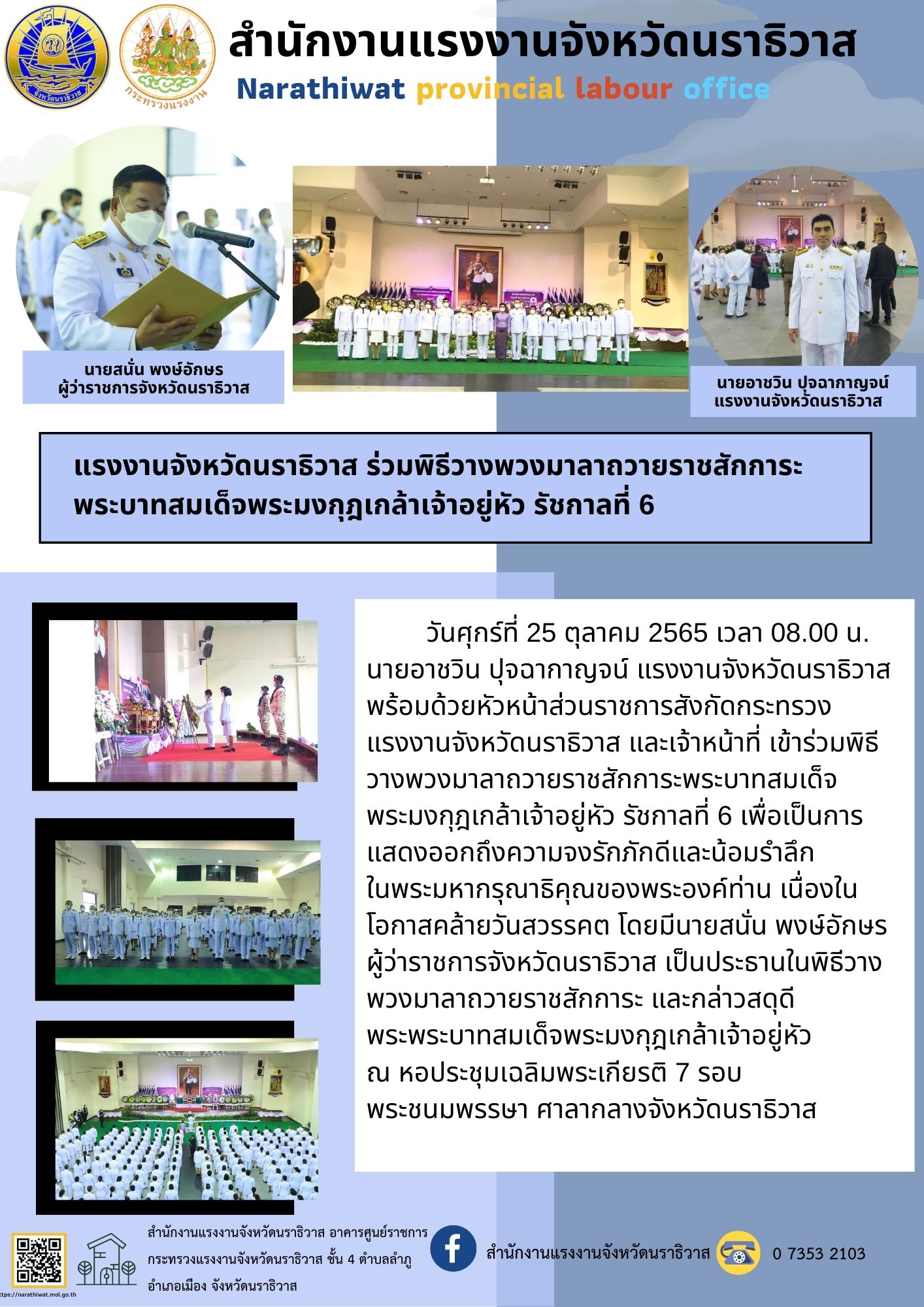 แรงงานจังหวัดนราธิวาส ร่วมพิธีวางพวงมาลาถวายราชสักการะ พระบาทสมเด็จพระมงกุฎเกล้าเจ้าอยู่หัว รัชกาลที่ 6