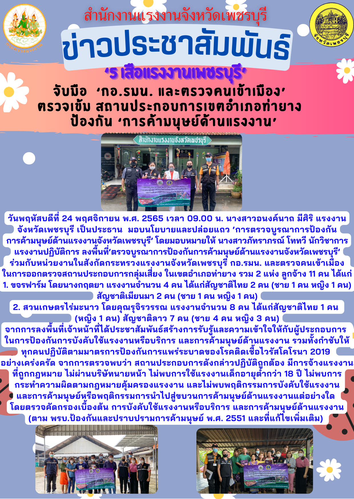 ‘5 เสือแรงงานเพชรบุรี’ จับมือ ‘กอ.รมน. และตรวจคนเข้าเมือง’ ตรวจเข้ม สถานประกอบการเขตอำเภอท่ายาง ป้องกัน ‘การค้ามนุษย์ด้านแรงงาน’