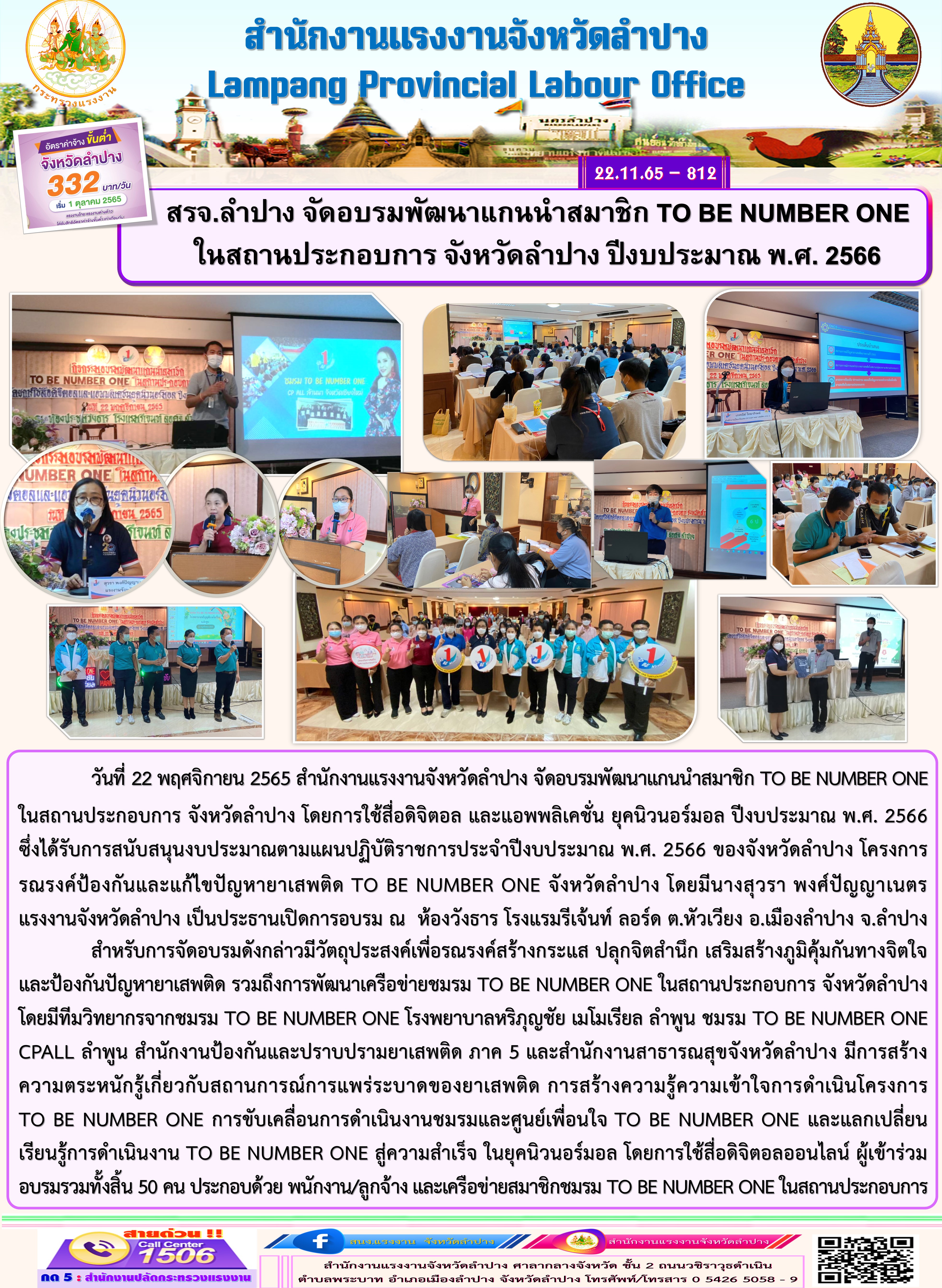 สำนักงานแรงงานจังหวัดลำปาง จัดอบรมพัฒนาแกนนำสมาชิก TO BE NUMBER ONE ในสถานประกอบการ จังหวัดลำปาง โดยการใช้สื่อดิจิตอล และแอพพลิเคชั่น ยุคนิวนอร์มอล ปีงบประมาณ พ.ศ. 2566