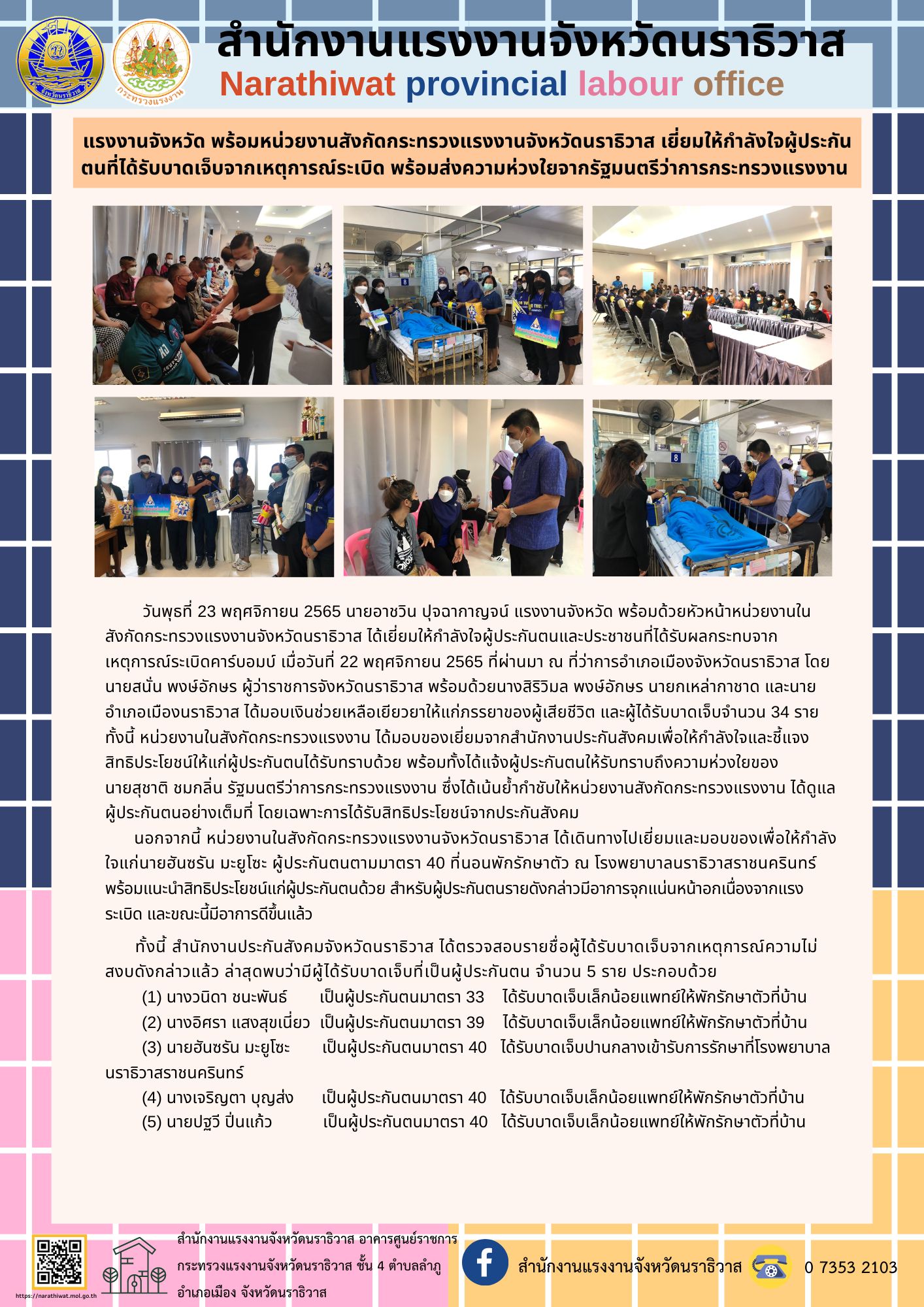 แรงงานจังหวัด พร้อมหน่วยงานสังกัดกระทรวงแรงงานจังหวัดนราธิวาส เยี่ยมให้กำลังใจผู้ประกันตนที่ได้รับบาดเจ็บจากเหตุการณ์ระเบิด พร้อมส่งความห่วงใยจากรัฐมนตรีว่าการกระทรวงแรงงาน