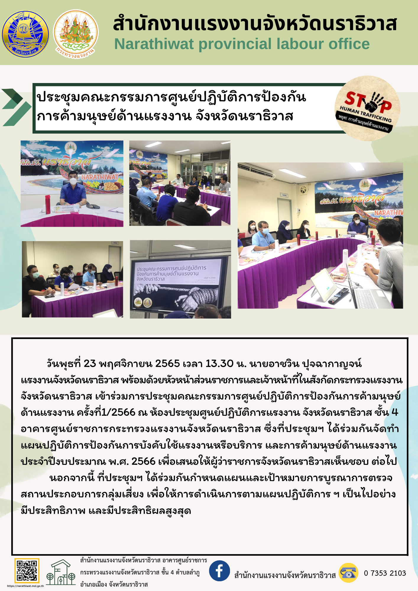 ประชุมคณะกรรมการศูนย์ปฏิบัติการป้องกัน การค้ามนุษย์ด้านแรงงาน จังหวัดนราธิวาส