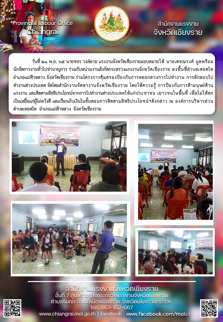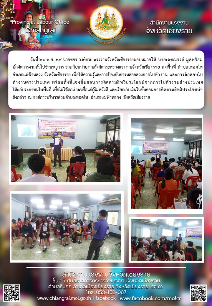 ผู้แทนแรงงาน ลงพื้นที่ ตำบลเทอดไท อำเภอแม่ฟ้าหลวง จังหวัดเชียงราย เพื่อให้ความรู้และการป้องกันการหลอกลวงการไปทำงาน และการลักลอบไปทำงานต่างประเทศ พร้อมทั้งชี้แจงขั้นตอนการติดตามสิทธิประโยชน์จากการไปทำงานต่างประเทศให้แก่ประชาชนในพื้นที่