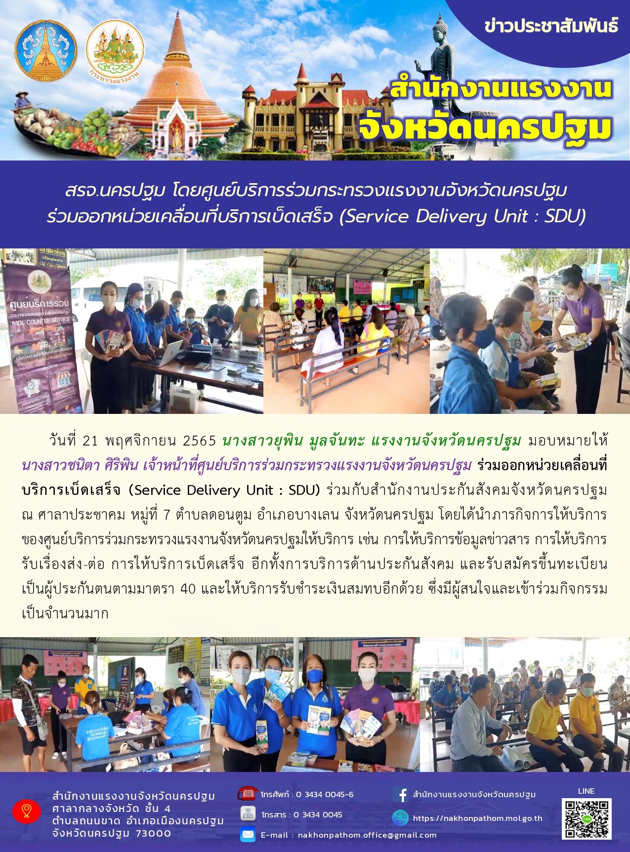 สรจ.นครปฐม โดยศูนย์บริการร่วมกระทรวงแรงงานจังหวัดนครปฐม ร่วมออกหน่วยเคลื่อนที่บริการเบ็ดเสร็จ (Service Delivery Unit :SDU)