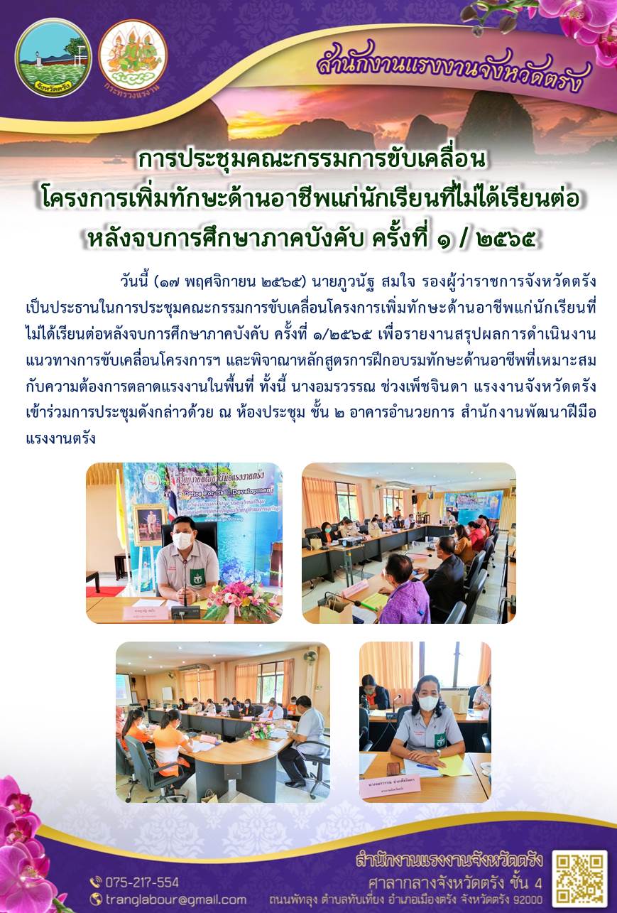 แรงงานจังหวัดตรัง ร่วมการประชุมคณะกรรมการขับเคลื่อนโครงการเพิ่มทักษะด้านอาชีพแก่นักเรียนที่ไม่ได้เรียนต่อหลังจบการศึกษาภาคบังคับ ครั้งที่ 1/2565