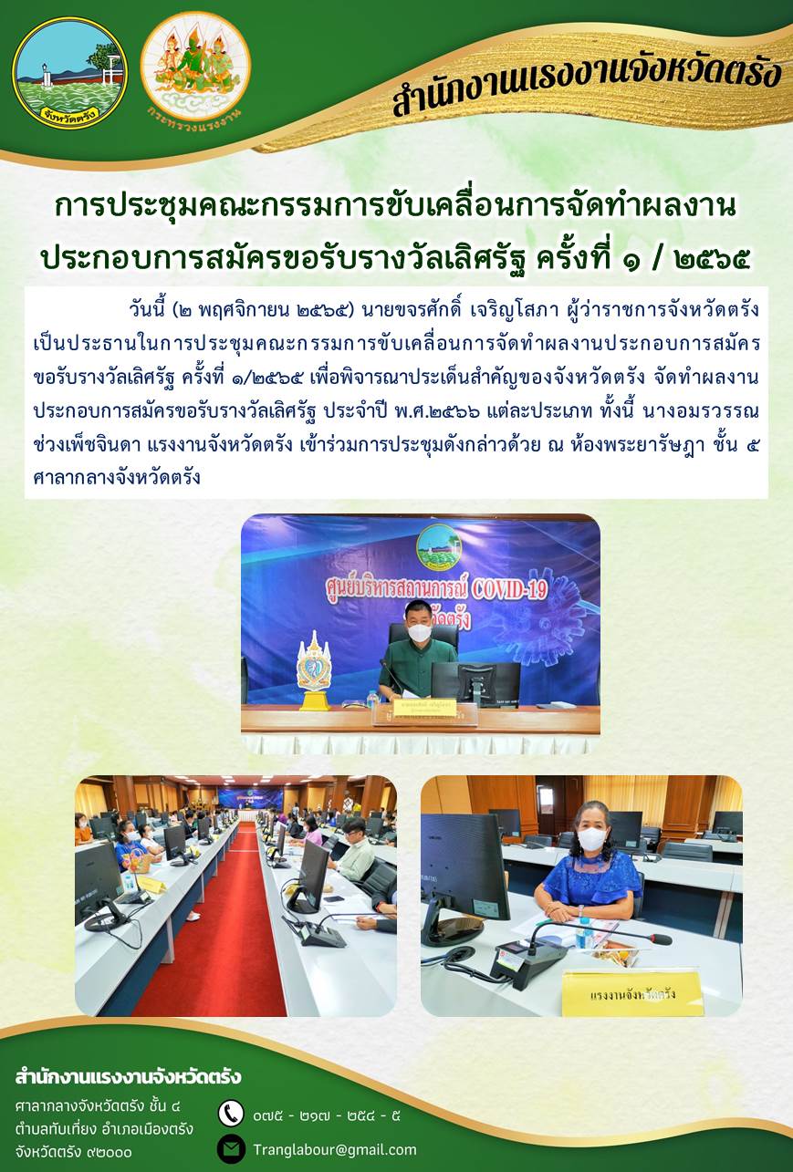 แรงงานจังหวัดตรัง ร่วมการประชุมคณะกรรมการขับเคลื่อนการจัดทำผลงานประกอบการสมัครขอรับรางวัลเลิศรัฐ ครั้งที่ 1/2565