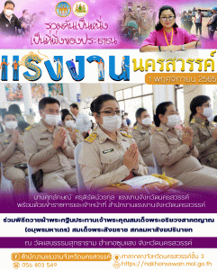 แรงงานจังหวัดนครสวรรค์ พร้อมด้วยข้าราชการและเจ้าหน้าที่ ร่วมพิธีถวายผ้าพระกฐินประทานเจ้าพระคุณสมเด็จพระอริยวงสาคตญาณ (อมฺพรมหาเถร) สมเด็จพระสังฆราช สกลมหาสังฆปรินายก ณ วัดแสงธรรมสุทธาราม อำเภอชุมแสง จังหวัดนครสวรรค์