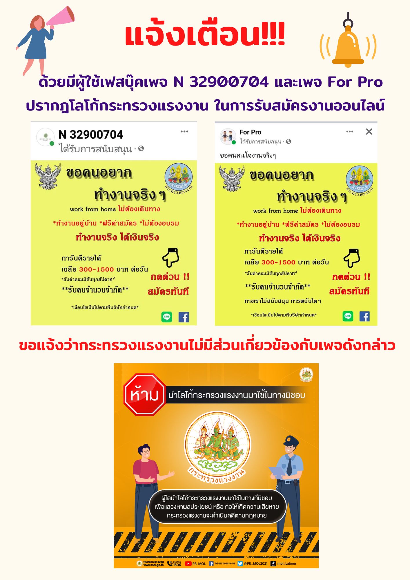 แจ้งเตือน! เนื่องด้วยมีผู้ใช้เฟสบุ๊คเพจ นำโลโก้กระทรวงแรงงานในการรับสมัครงานออนไลน์ จึงขอแจ้งว่ากระทรวงแรงงานไม่มีส่วนเกี่ยวข้องกับเพจดังกล่าว