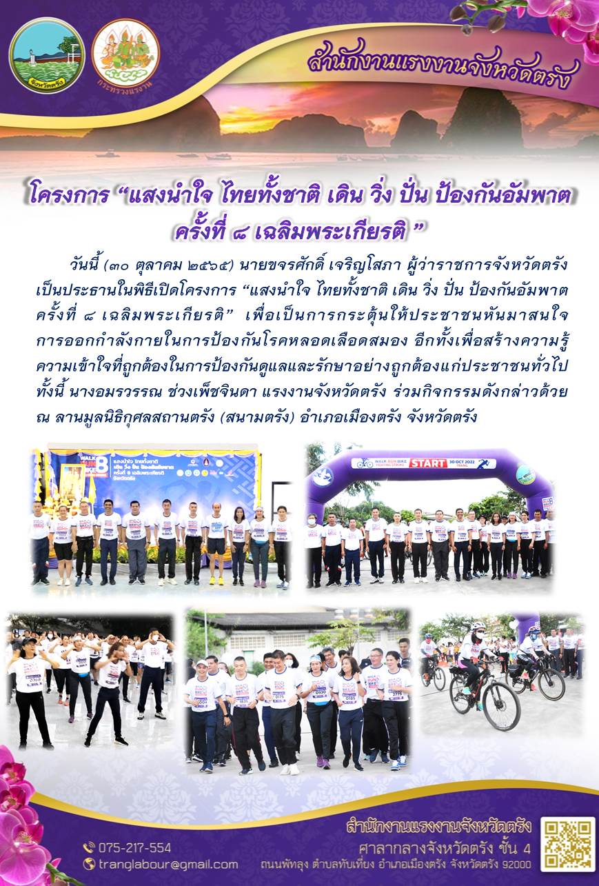 แรงงานจังหวัดตรัง ร่วมพิธีเปิดโครงการ “แสงนำใจ ไทยทั้งชาติ เดิน วิ่ง ปั่น ป้องกันอัมพาต ครั้งที่ 8 เฉลิมพระเกียรติ”