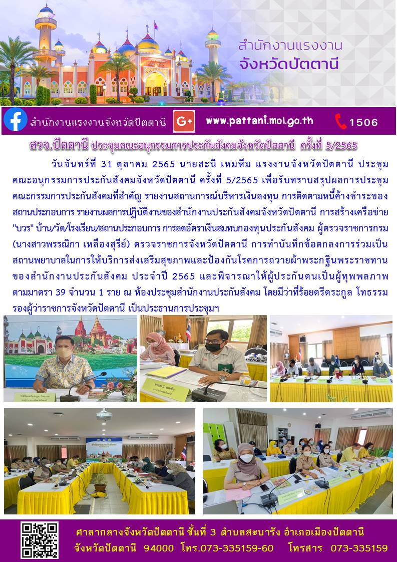 สรจ.ปัตตานี ประชุมคณะอนุกรรมการประกันสังคมจังหวัดปัตตานี ครั้งที่ 5/2565