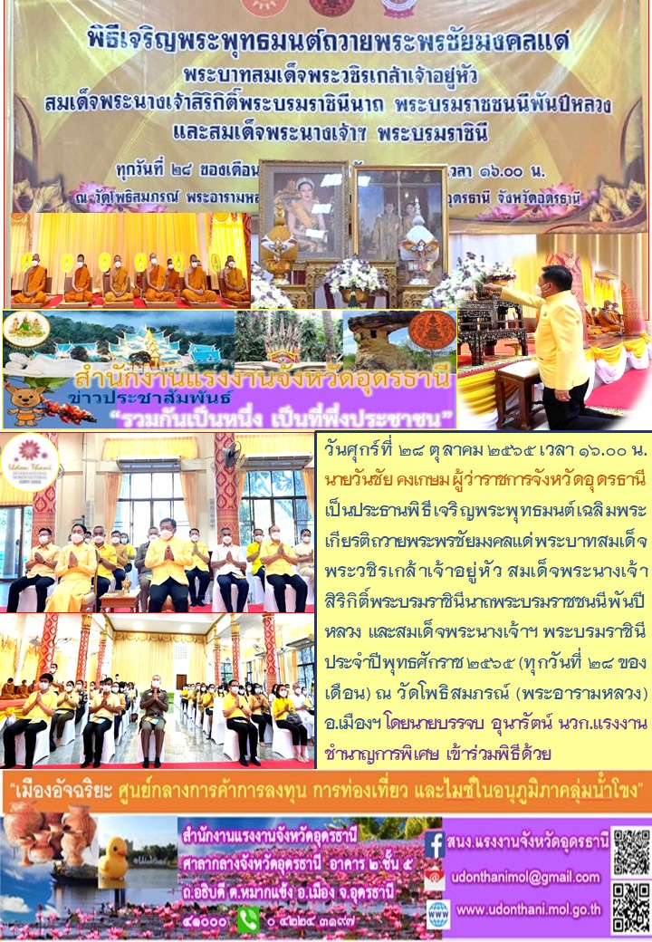 แรงงานจังหวัดตาก ร่วมพิธีเจริญพระพุทธมนต์ถวายพระพรชัยมงคลแด่พระบาทสมเด็จพระเจ้าอยู่หัว สมเด็จพระนางเจ้าสิริกิติ์ พระบรมราชินีนาถ พระบรมราชชนนีพันปีหลวง และสมเด็จพระนางเจ้าฯ พระบรมราชินี ประจำปี พ.ศ. 2565