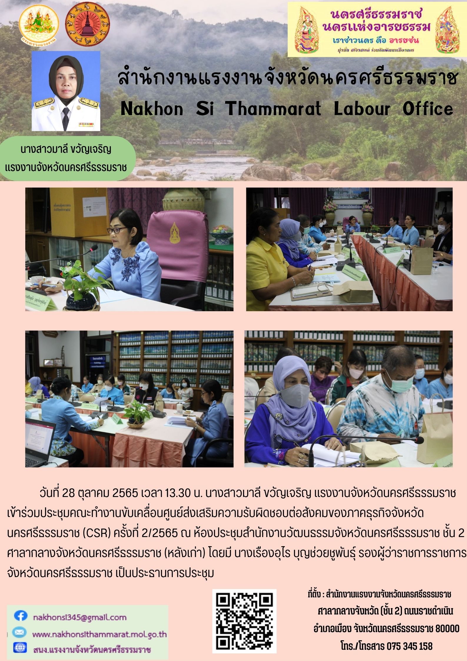 นางสาวมาลี ขวัญเจริญ แรงงานจังหวัดนครศรีธรรมราช เข้าร่วมประชุมคณะทำงานขับเคลื่อนศูนย์ส่งเสริมความรับผิดชอบต่อส่งคมของภาคธุรกิจจังหวัดนครศรีธรรมราช (CSR) ครั้งที่ 2/2565 โดยมี นางเรืองอุไร บุญช่วยชูพันธุ์ รองผู้ว่าราชการจังหวัดนครศรีธรรมราช เป็นประธานการประชุมคณะทำงาน