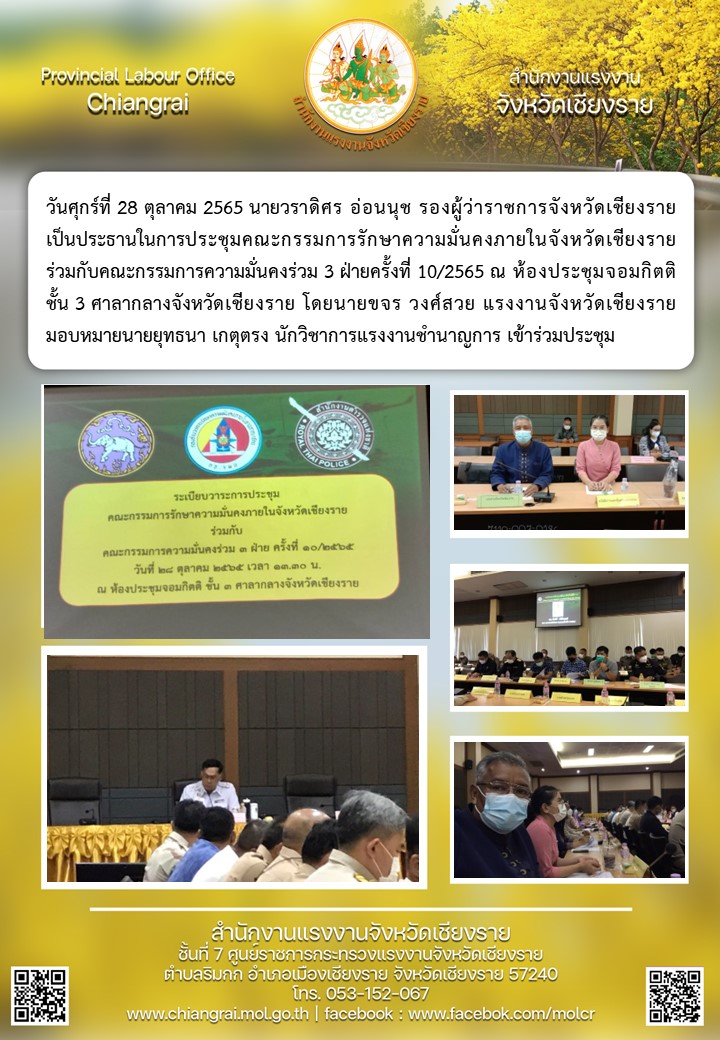 ผู้แทนแรงงานจังหวัด ร่วมประชุมคณะกรรมการรักษาความมั้นคงภายใน จ.เชียงราย ครั้งที่ 10/2565