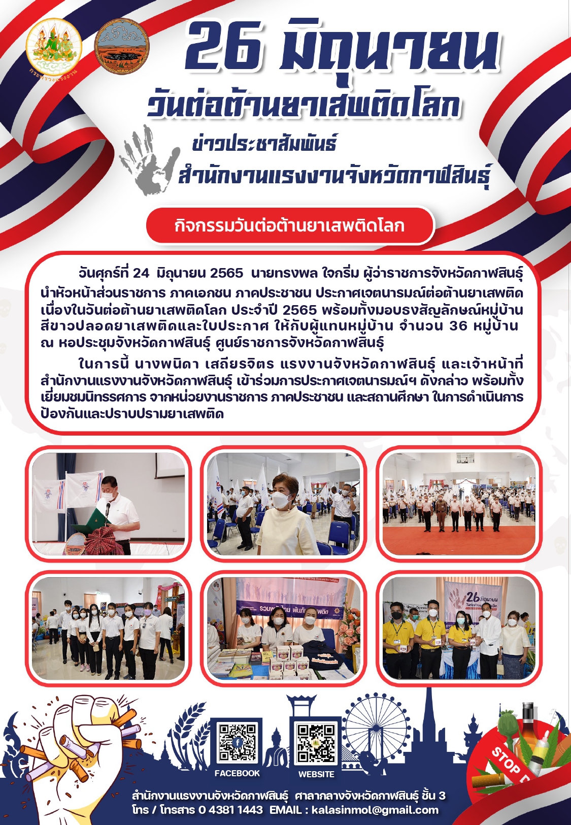 แรงงานจังหวัดกาฬสินธุ์ ร่วมกิจกรรมการประกาศเจตนารมณ์ต่อต้านยาเสพติด และมอบธงสัญลักษณ์ให้แก่หมู่บ้านสีขาวปลอดยาเสพติด เนื่องในวันต่อต้านยาเสพติดโลก (26 มิถุนายน) ประจำปี 2565