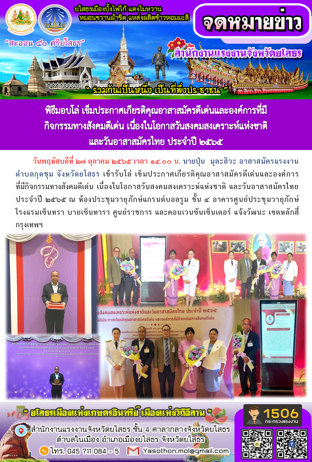 พิธีมอบโล่ เข็มประกาศเกียรติคุณอาสาสมัครดีเด่นและองค์การที่มี กิจกรรมทางสังคมดีเด่น เนื่องในโอกาสวันสงคมสงเคราะห์แห่งชาติ และวันอาสาสมัครไทย ประจำปี 2565