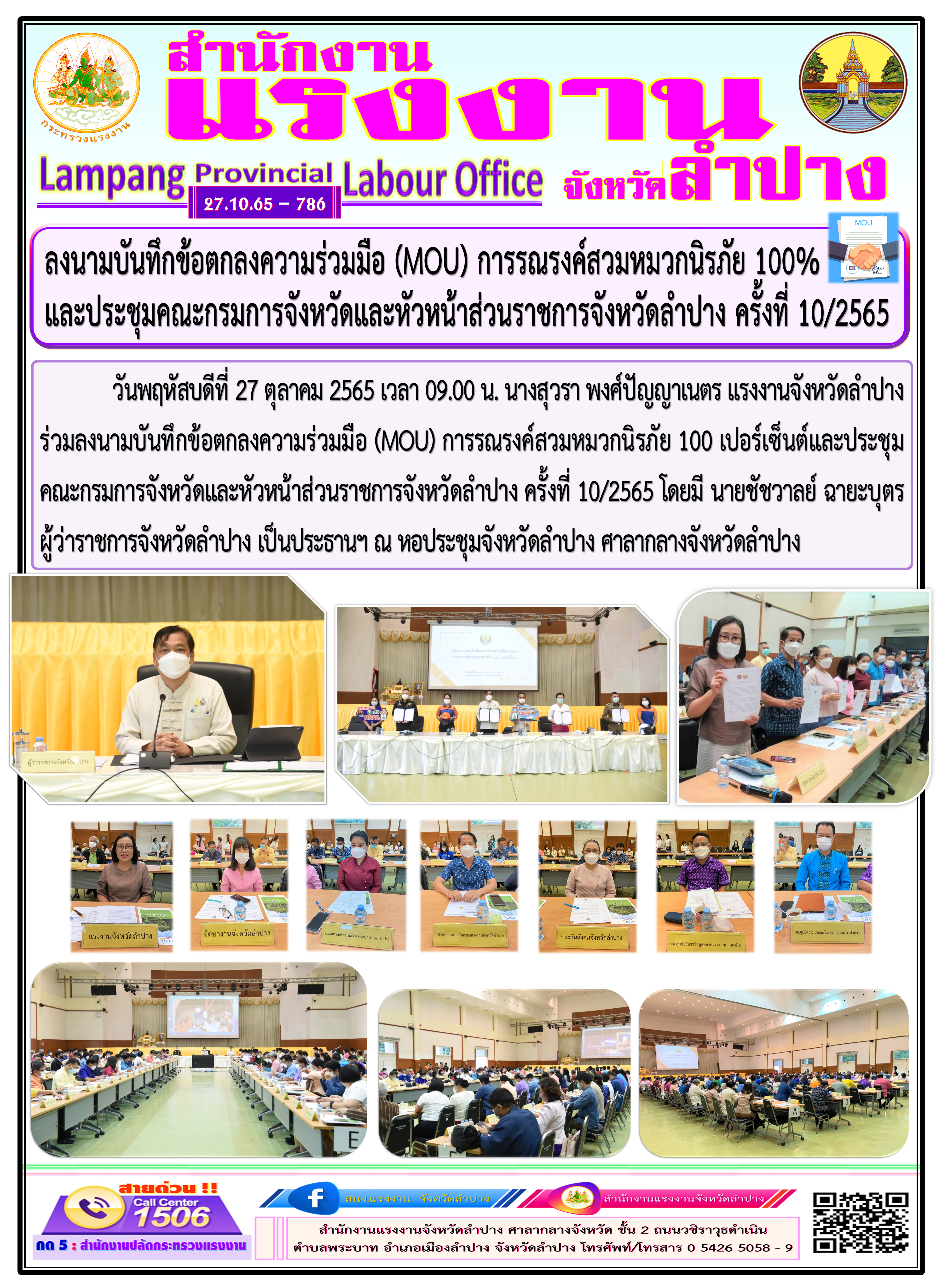 ลงนามบันทึกข้อตกลงความร่วมมือ (MOU) การรณรงค์สวมหมวกนิรภัย 100% และประชุมคณะกรมการจังหวัดและหัวหน้าส่วนราชการจังหวัดลำปาง ครั้งที่ 10/2565