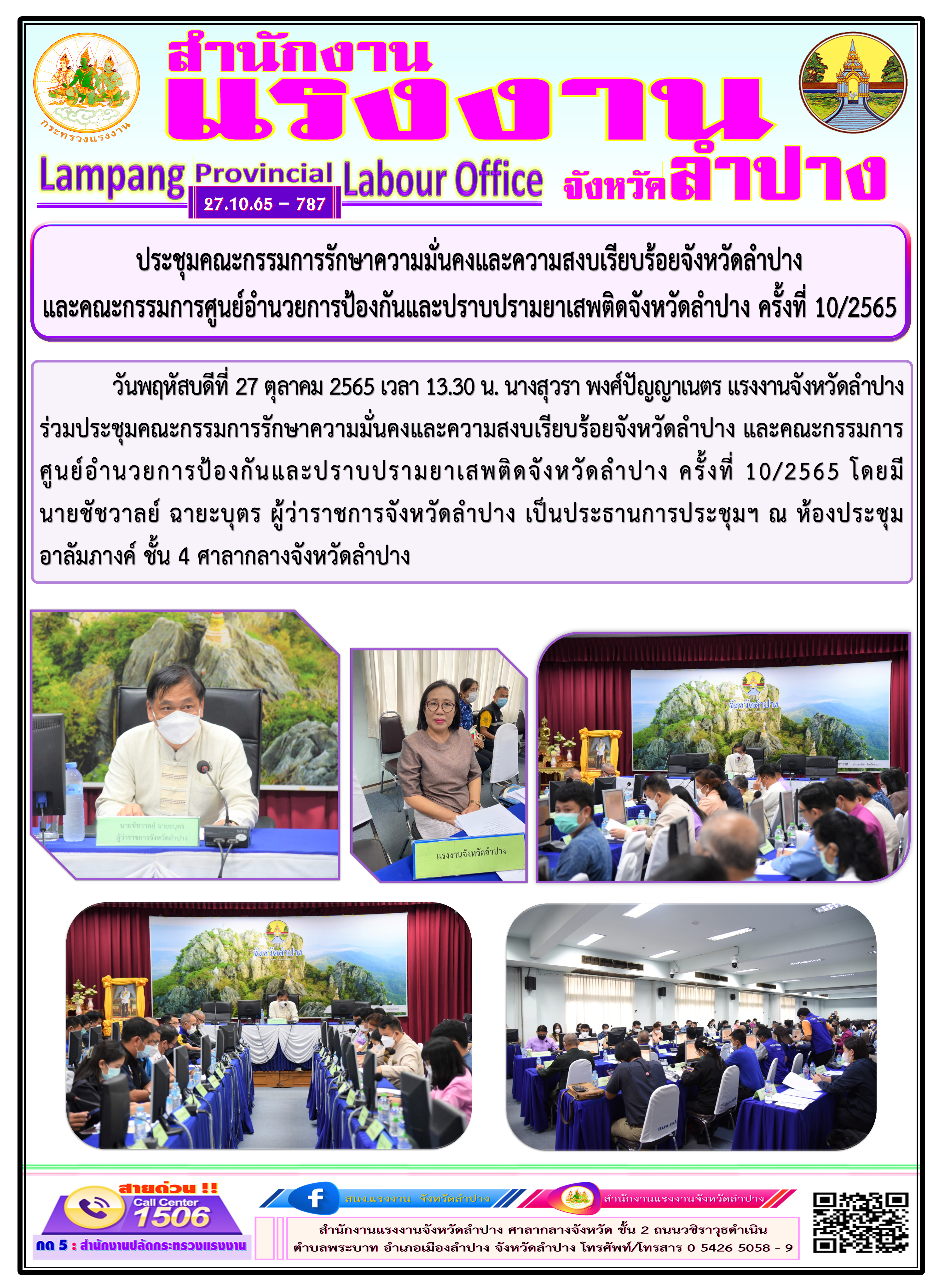 ประชุมคณะกรรมการรักษาความมั่นคงและความสงบเรียบร้อยจังหวัดลำปาง และคณะกรรมการศูนย์อำนวยการป้องกันและปราบปรามยาเสพติดจังหวัดลำปาง ครั้งที่ 10/2565