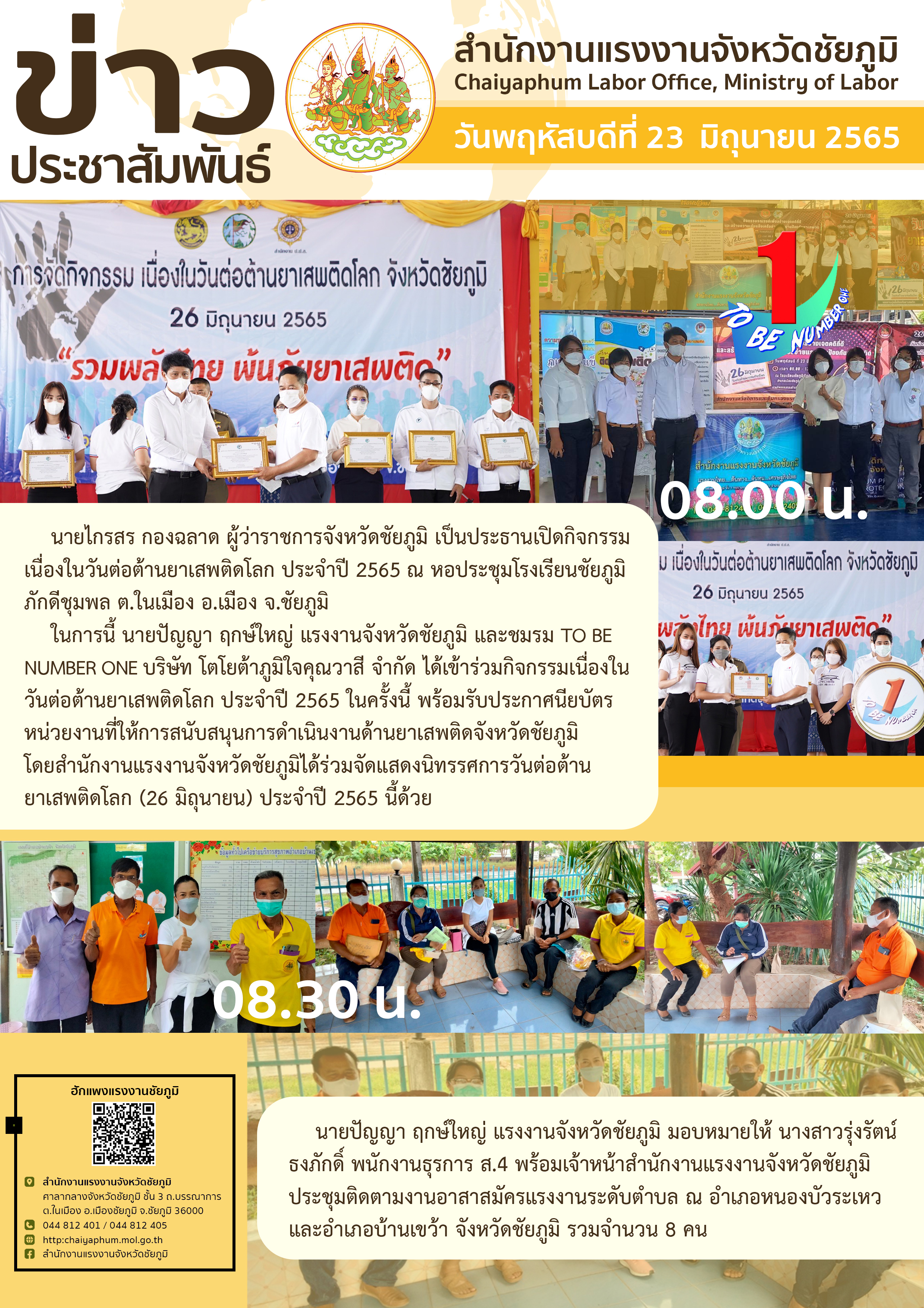 สรจ.ชัยภูมิ ร่วมกิจกรรมเนื่องในวันต่อต้านยาเสพติดโลก ประจำปี 2565 และประชุมติดตามงานอาสาสมัครแรงงานระดับตำบล