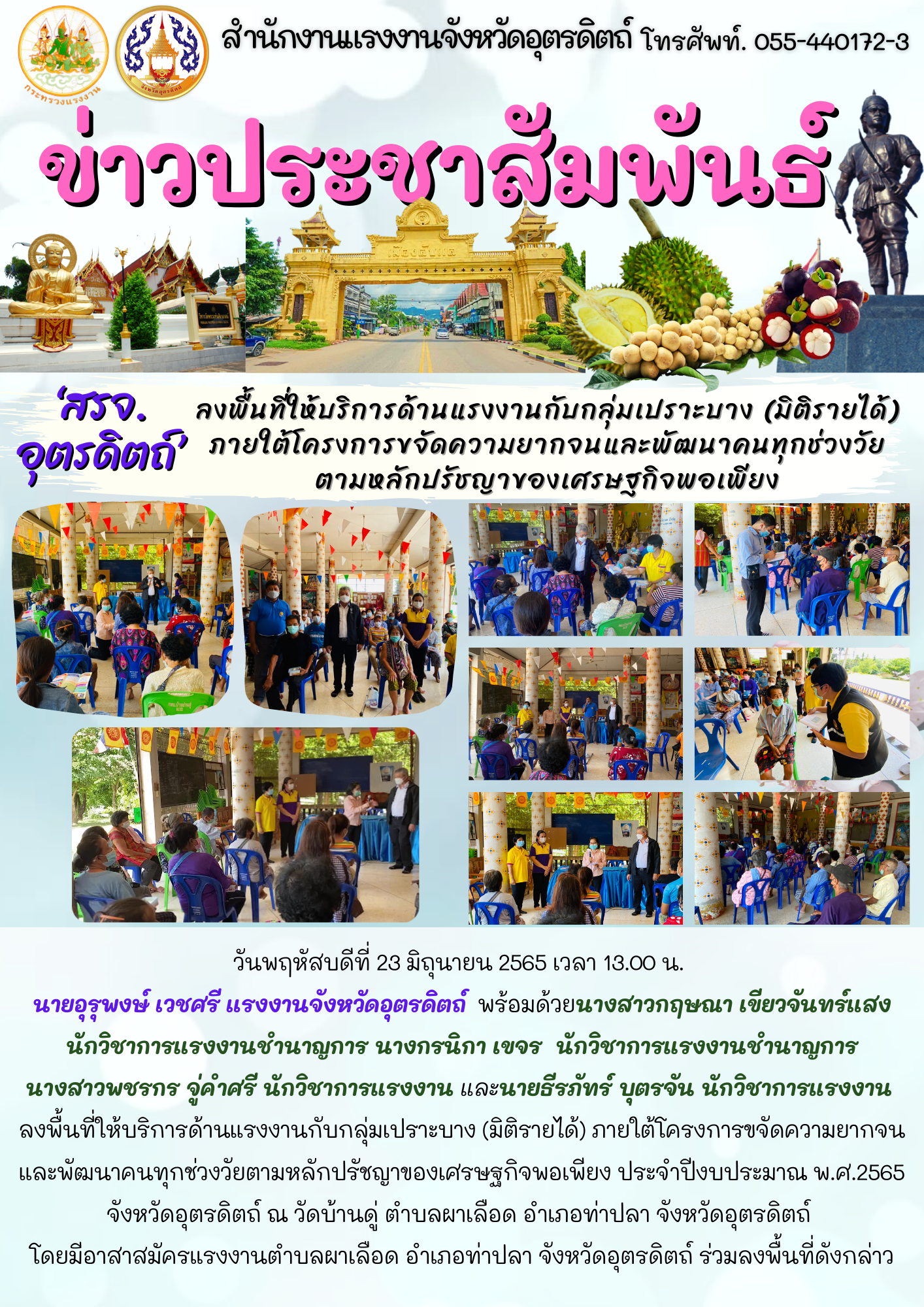 ‘สรจ. อุตรดิตถ์’ ลงพื้นที่ให้บริการด้านแรงงานกับกลุ่มเปราะบาง (มิติรายได้) ภายใต้โครงการขจัดความยากจนและพัฒนาคนทุกช่วงวัยตามหลักปรัชญาของเศรษฐกิจพอเพียง