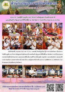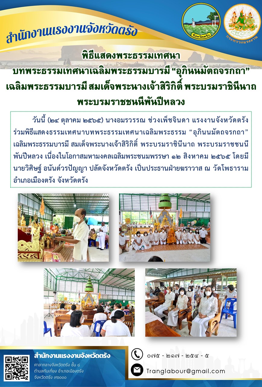 แรงงานจังหวัดตรัง ร่วมพิธีแสดงธรรมเทศนาบทพระธรรมเทศนาเฉลิมพระธรรม “อุภินนมัตถจรกถา” เฉลิมพระธรรมบารมี สมเด็จพระนางเจ้าสิริกิติ์ พระบรมราชินีนาถ พระบรมราชชนนีพันปีหลวง