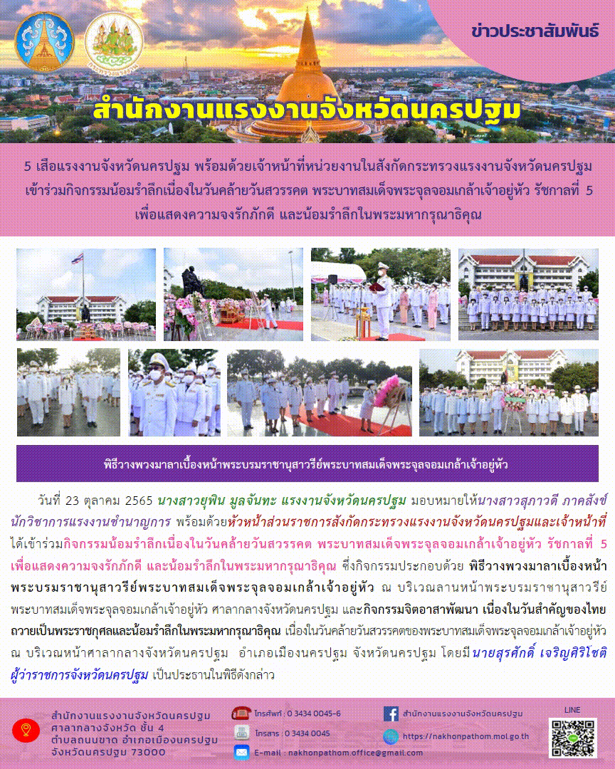 5 เสือแรงงานจังหวัดนครปฐม พร้อมด้วยเจ้าหน้าที่หน่วยงานในสังกัดกระทรวงแรงงานจังหวัดนครปฐม เข้าร่วมกิจกรรมน้อมรำลึกเนื่องในวันคล้ายวันสวรรคต พระบาทสมเด็จพระจุลจอมเกล้าเจ้าอยู่หัว รัชกาลที่ 5 เพื่อแสดงความจงรักภักดี และน้อมรำลึกในพระมหากรุณาธิคุณ