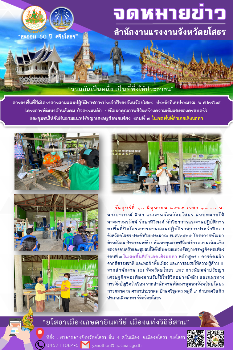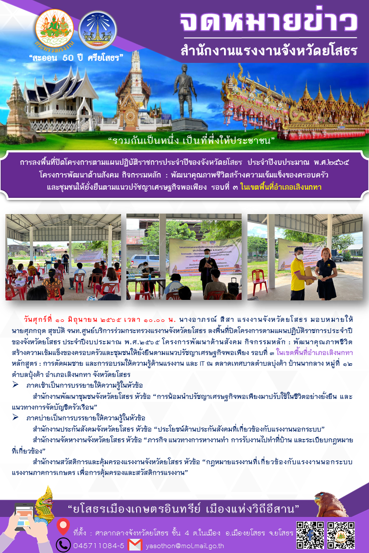 การลงพื้นที่โครงการตามแผนปฏิบัติราชการประจำปีของจังหวัดยโสธร ประจำปีงบประมาณ พ.ศ.2565 โครงการพัฒนาด้านสังคม กิจกรรมหลัก : พัฒนาคุณภาพชีวิตสร้างความเข้มแข็งของครอบครัวและชุมชนให้ยั่งยืนตามแนวปรัชญาเศรษฐกิจพอเพียง รอบที่ 3 ในเขตพื้นที่อำเภอเลิงนกทา