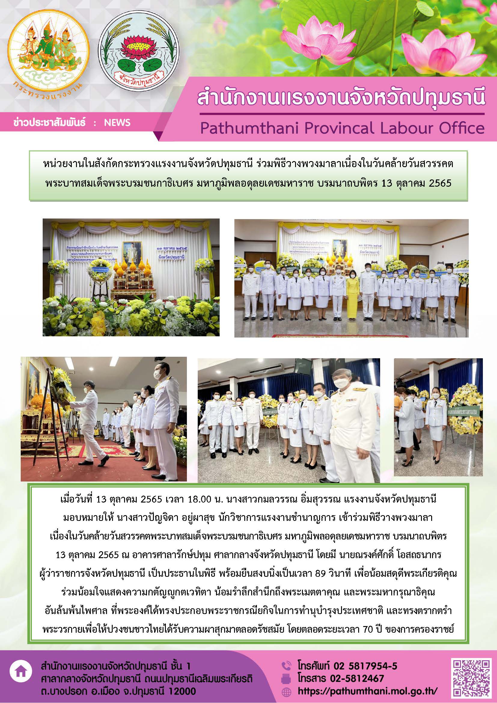 หน่วยงานในสังกัดกระทรวงแรงงานจังหวัดปทุมธานี ร่วมพิธีวางพวงมาลาเนื่องในวันคล้ายวันสวรรคต พระบาทสมเด็จพระบรมชนกาธิเบศร มหาภูมิพลอดุลยเดชมหาราช บรมนาถบพิตร 13 ตุลาคม 2565