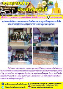 หน่วยงานสังกัดกระทรวงแรงงาน จังหวัดอ่างทอง มอบเนื้อหมูสด และน้ำดื่ม เพื่อเป็นวัตถุดิบในการปรุงอาหารช่วยเหลือผู้ประสบอุทกภัย