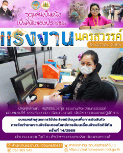 แรงงานจังหวัดนครสวรรค์ มอบหมายให้ นางสาวอารยา รัตนเทวมาตย์ นักวิชาการแรงงานปฏิบัติการ อบรมหลักสูตรการใช้ประโยชน์ข้อมูลเพื่อการตัดสินใจ การจัดทำรายงานอัจริยะตอบโจทย์การขับเคลื่อนจังหวัดดิจิทัล ครั้งที่ 14/2565