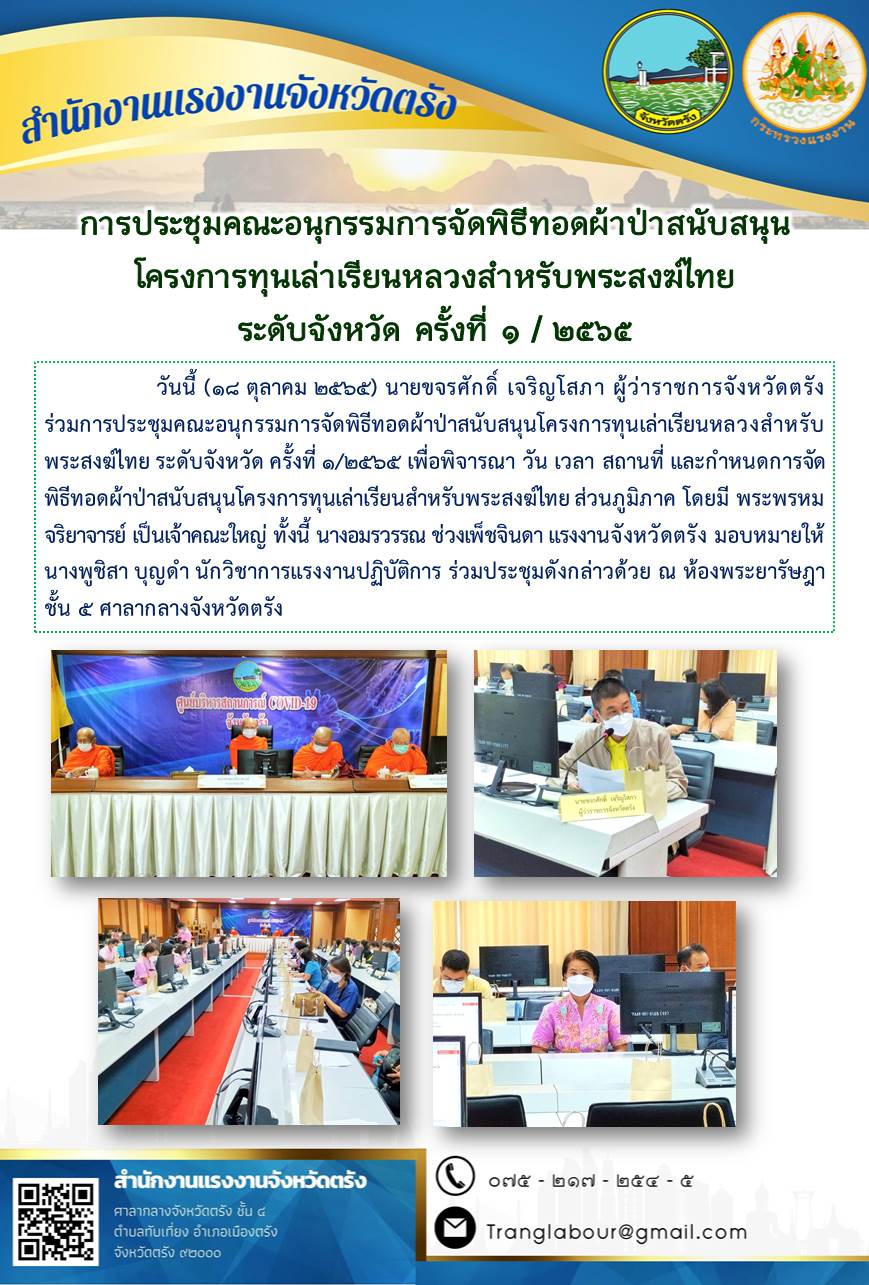 แรงงานจังหวัดตรัง มอบหมายให้ นางพูชิสา บุญดำ นักวิชาการแรงงานปฏิบัติการ ร่วมการประชุมคณะอนุกรรมการจัดพิธีทอดผ้าป่าสนับสนุนโครงการทุนเล่าเรียนหลวงสำหรับพระสงฆ์ไทย ระดับจังหวัด ครั้งที่ 1/2565