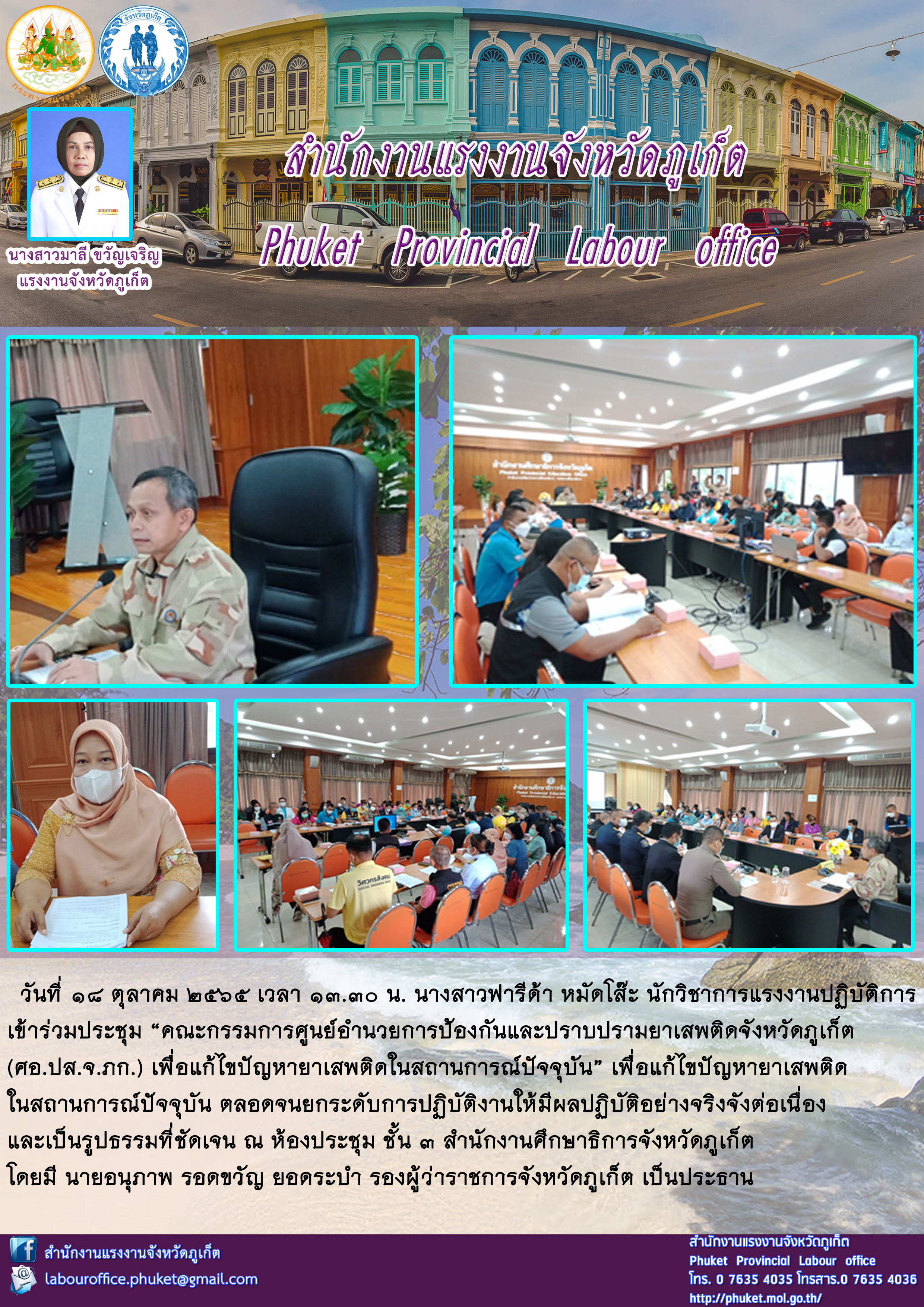 วันที่ 18 ตุลาคม 2565 เวลา 13.30 น. นางสาวฟารีด้า หมัดโส๊ะ นักวิชาการแรงงานปฏิบัติการ เข้าร่วมประชุม “คณะกรรมการศูนย์อำนวยการป้องกันและปราบปรามยาเสพติดจังหวัดภูเก็ต (ศอ.ปส.จ.ภก.) เพื่อแก้ไขปัญหายาเสพติดในสถานการณ์ปัจจุบัน”