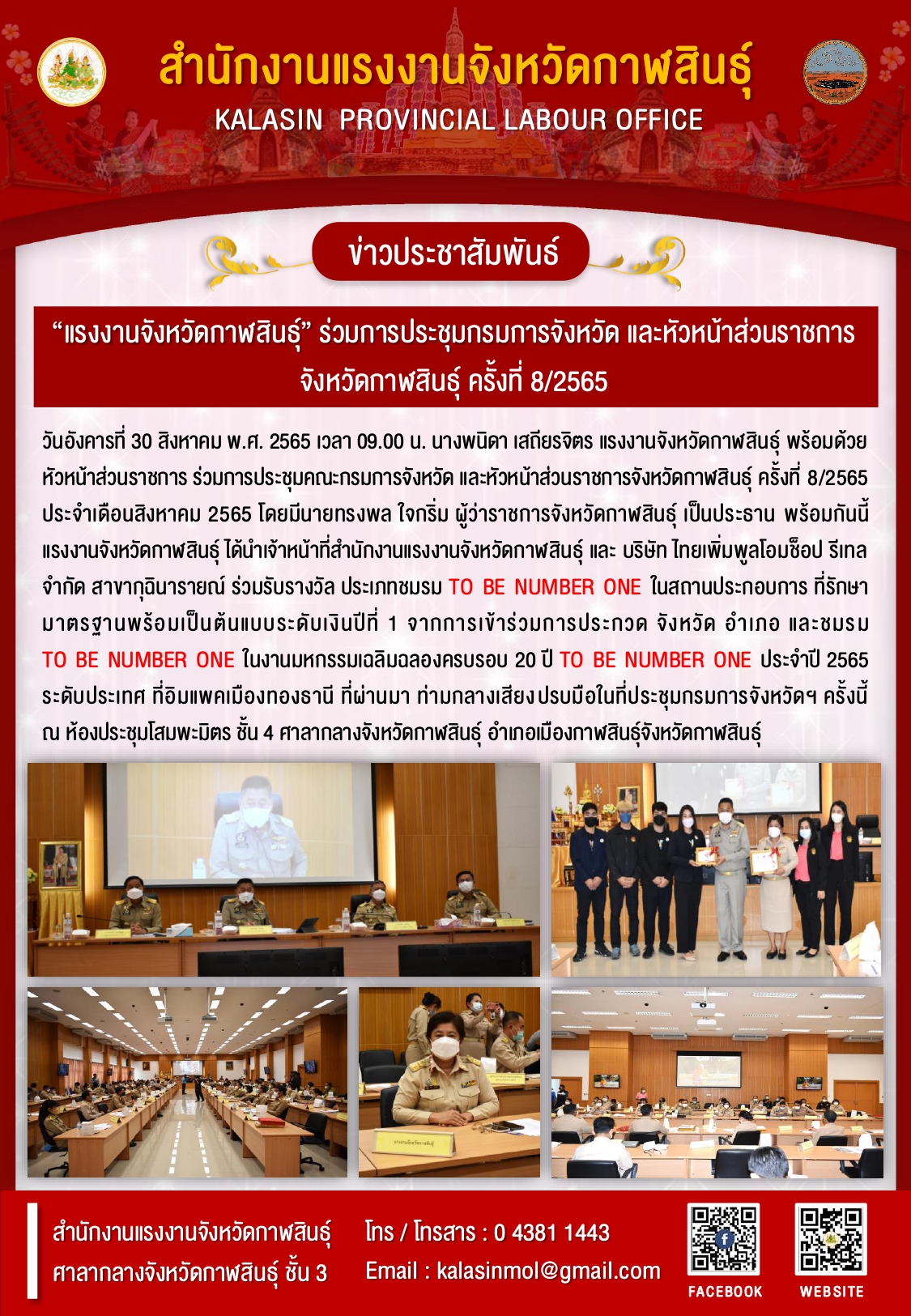 แรงงานจังหวัดกาฬสินธุ์ ร่วมการประชุมคณะกรมการจังหวัด และหัวหน้าส่วนราชการจังหวัดกาฬสินธุ์ ครั้งที่ 8/2565