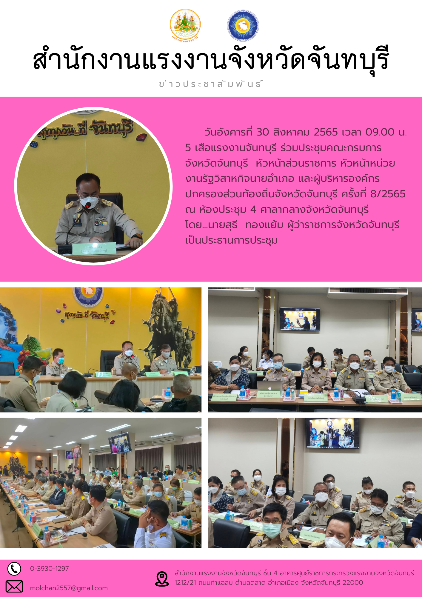 5 เสือแรงงานจันทบุรี ร่วมประชุมคณะกรมการจังหวัดจันทบุรี หัวหน้าส่วนราชการ หัวหน้าหน่วยงานรัฐวิสาหกิจนายอำเภอ และผู้บริหารองค์กรปกครองส่วนท้องถิ่นจังหวัดจันทบุรี ครั้งที่ 8/2565