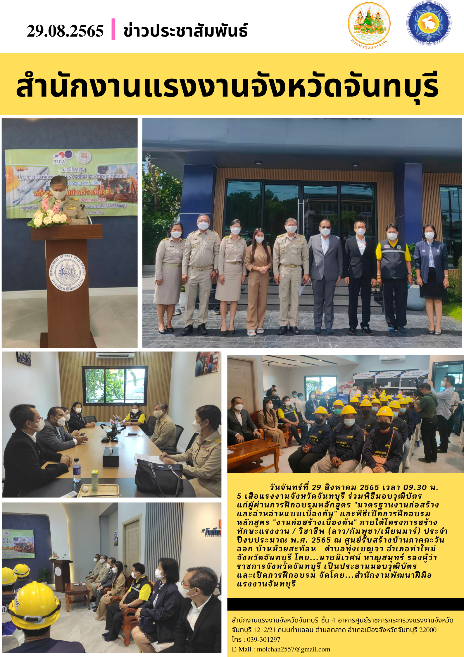 5 เสือแรงงานจังหวัดจันทบุรี ร่วมพิธีมอบวุฒิบัตร แก่ผู้ผ่านการฝึกอบรมหลักสูตร “มาตรฐานงานก่อสร้างและอ่านอ่านแบบเบื้องต้น” และพิธีเปิดการฝึกอบรม หลักสูตร “งานก่อสร้างเบื้องต้น” ภายใต้โครงการสร้างทักษะแรงงาน / วิชาชีพ (ลาว/กัมพูชา/เมียนมาร์) ประจำปีงบประมาณ พ.ศ. 2565