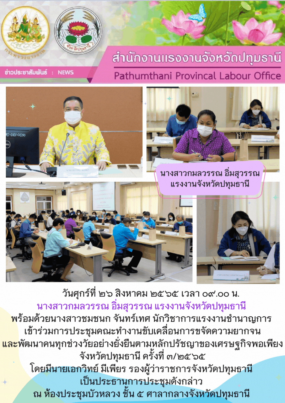แรงงานจังหวัดปทุมธานี ร่วมการประชุมคณะทำงานขับเคลื่อนการขจัดความยากจนและพัฒนาคนทุกช่วงวัยอย่างยั่งยืนตามหลักปรัชญาของเศรษฐกิจพอเพียงจังหวัดปทุมธานี ครั้งที่ ๓/๒๕๖๕