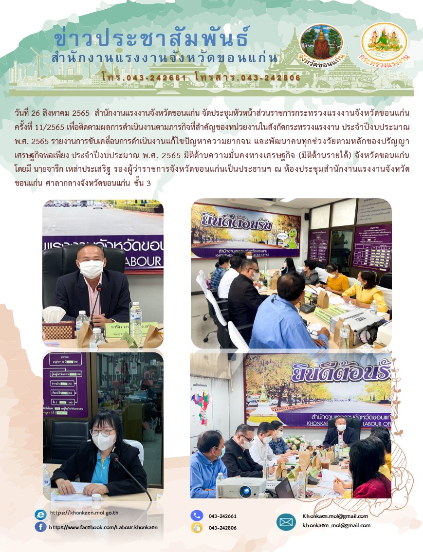 สำนักงานแรงงานจังหวัดขอนแก่นจัดประชุมหัวหน้าส่วนราชการกระทรวงแรงงานจังหวัดขอนแก่น ครั้งที่ 11/2565