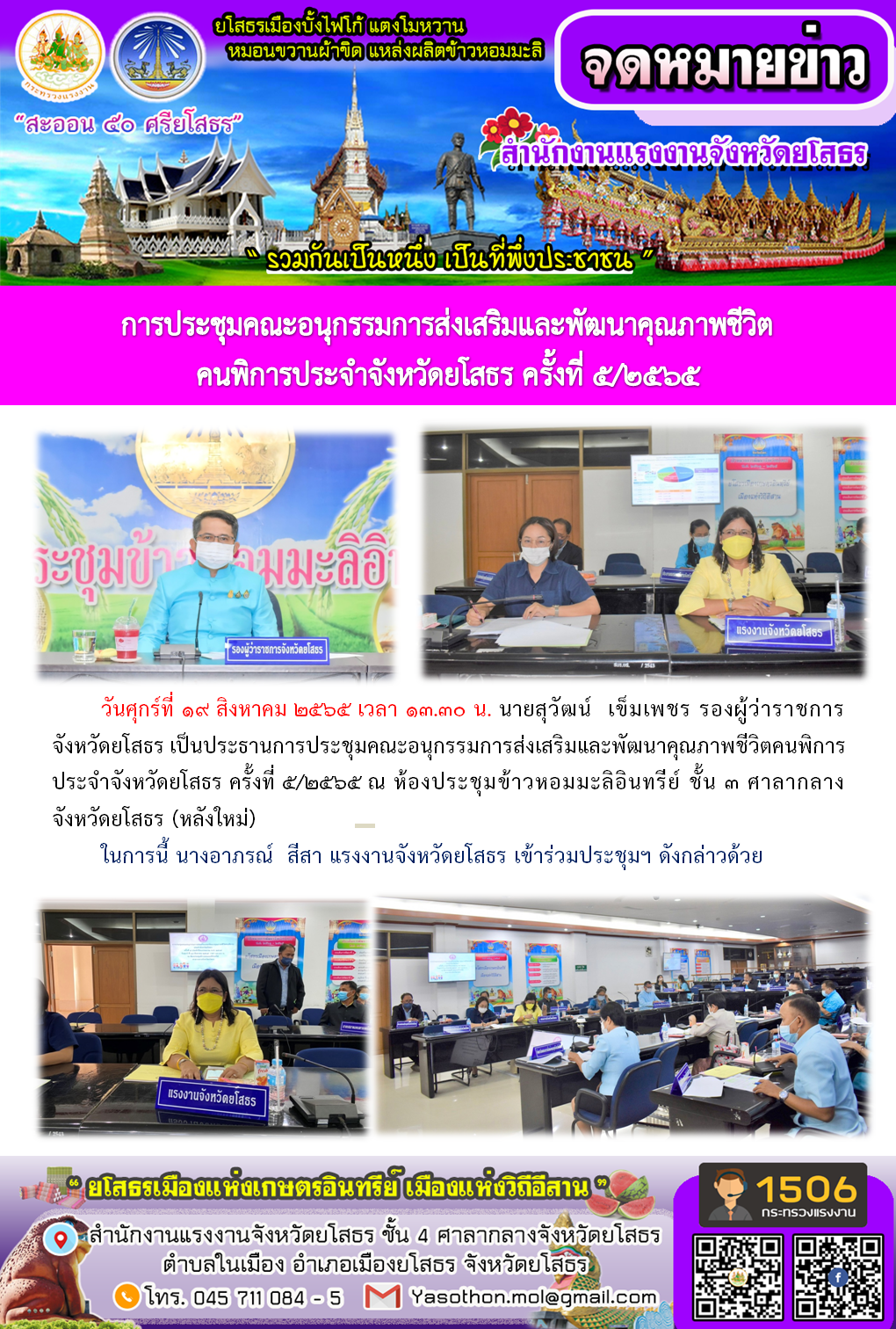 สรจ.ยส. เข้าร่วมประชุมคณะอนุกรรมการส่งเสริมและพัฒนาคุณภาพชีวิต คนพิการประจำจังหวัดยโสธร ครั้งที่ 5/2565