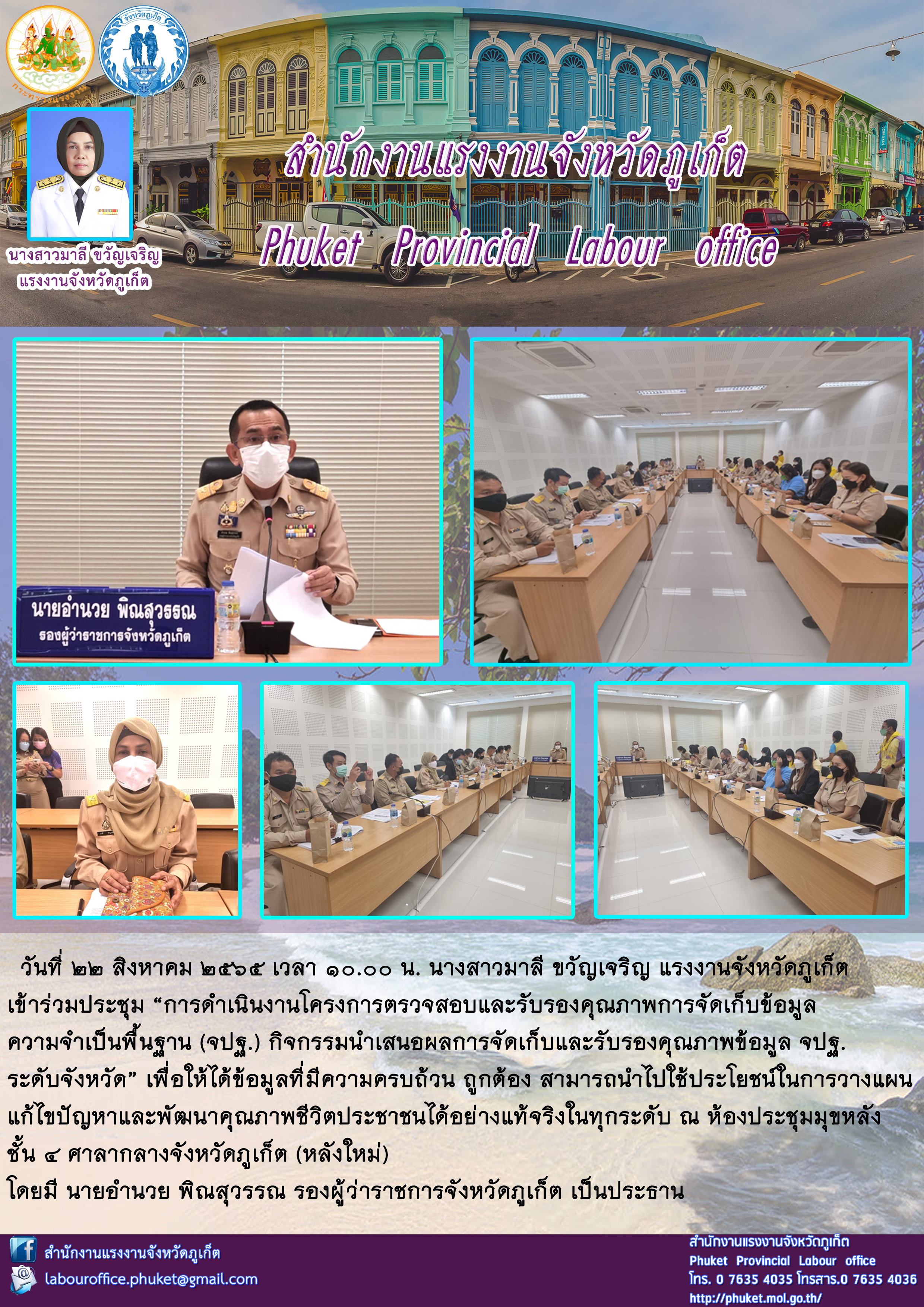 นางสาวมาลี ขวัญเจริญ แรงงานจังหวัดภูเก็ต เข้าร่วมประชุม “การดำเนินงานโครงการตรวจสอบและรับรองคุณภาพการจัดเก็บข้อมูลความจำเป็นพื้นฐาน (จปฐ.) กิจกรรมนำเสนอผลการจัดเก็บและรับรองคุณภาพข้อมูล จปฐ. ระดับจังหวัด”