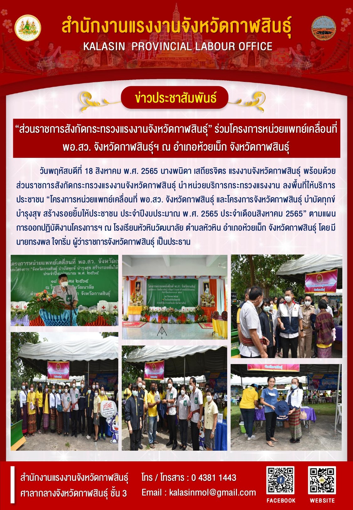 ส่วนราชการสังกัดกระทรวงแรงงานจังหวัดกาฬสินธุ์ ร่วมกิจกรรม “โครงการหน่วยแพทย์เคลื่อนที่ พอ.สว. จังหวัดกาฬสินธุ์ และโครงการจังหวัดกาฬสินธุ์ บำบัดทุกข์ บำรุงสุข สร้างรอยยิ้มให้ประชาชน