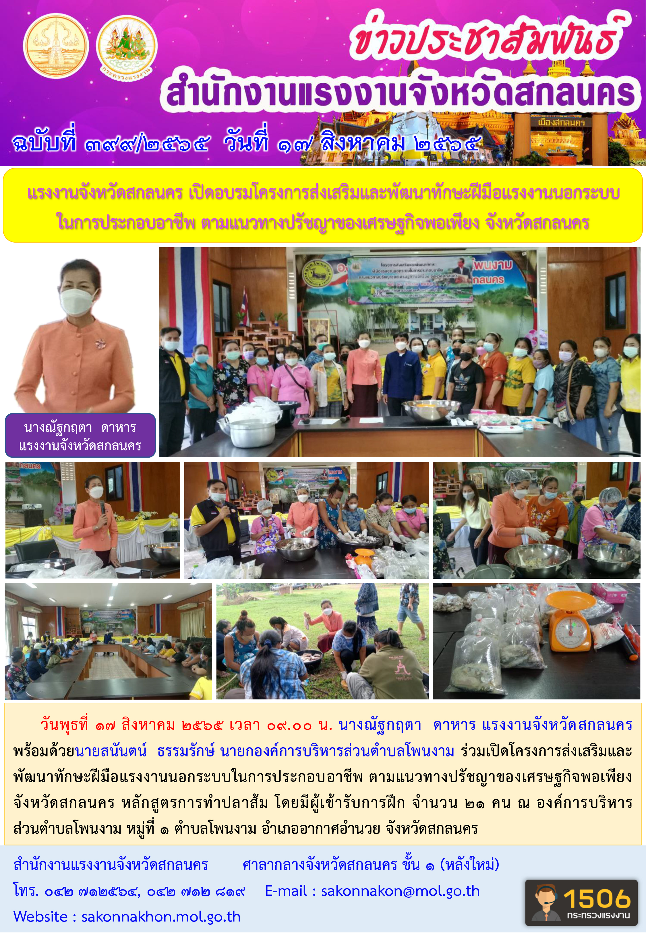 สรจ.สกลนคร เปิดอบรมโครงการส่งเสริมและพัฒนาทักษะฝีมือแรงงานนอกระบบในการประกอบอาชีพ ตามแนวทางปรัชญาของเศรษฐกิจพอเพียง