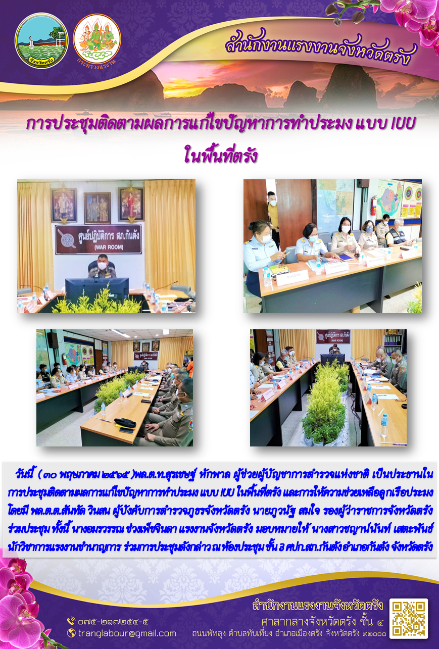 สรจ.ตรัง ร่วมการประชุมติดตามผลการแก้ไขปัญหาการทำประมง แบบ IUU ในพื้นที่ตรัง และการให้ความช่วยเหลือลูกเรือประมงที่กระโดดทะเลหนีจากเรือประมง
