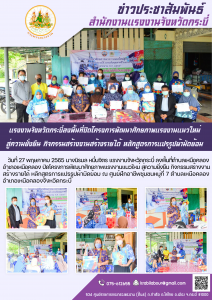 แรงงานจังหวัดกระบี่ลงพื้นที่ปิดโครงการพัฒนาศักยภาพแรงงานแนวใหม่สุ่ความยั่งยืน กิจกรรมสร้างงานสร้างรายได้ หลักสูตรการแปรรูปผ้ามัดย้อม