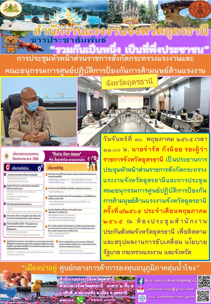 การประชุมหัวหน้าส่วนราชการสังกัดกระทรวงแรงงานและคณะอนุกรรมการศูนย์ปฏิบัติการป้องกันการค้ามนุษย์ด้านแรงงานจังหวัดอุดรธานี