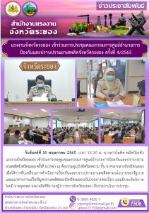 แรงงานจังหวัดระยอง เข้าร่วมการประชุมคณะกรรมการศูนย์อำนวยการป้องกันและปราบปรามยาเสพติดจังหวัดระยอง ครั้งที่ 4/2565