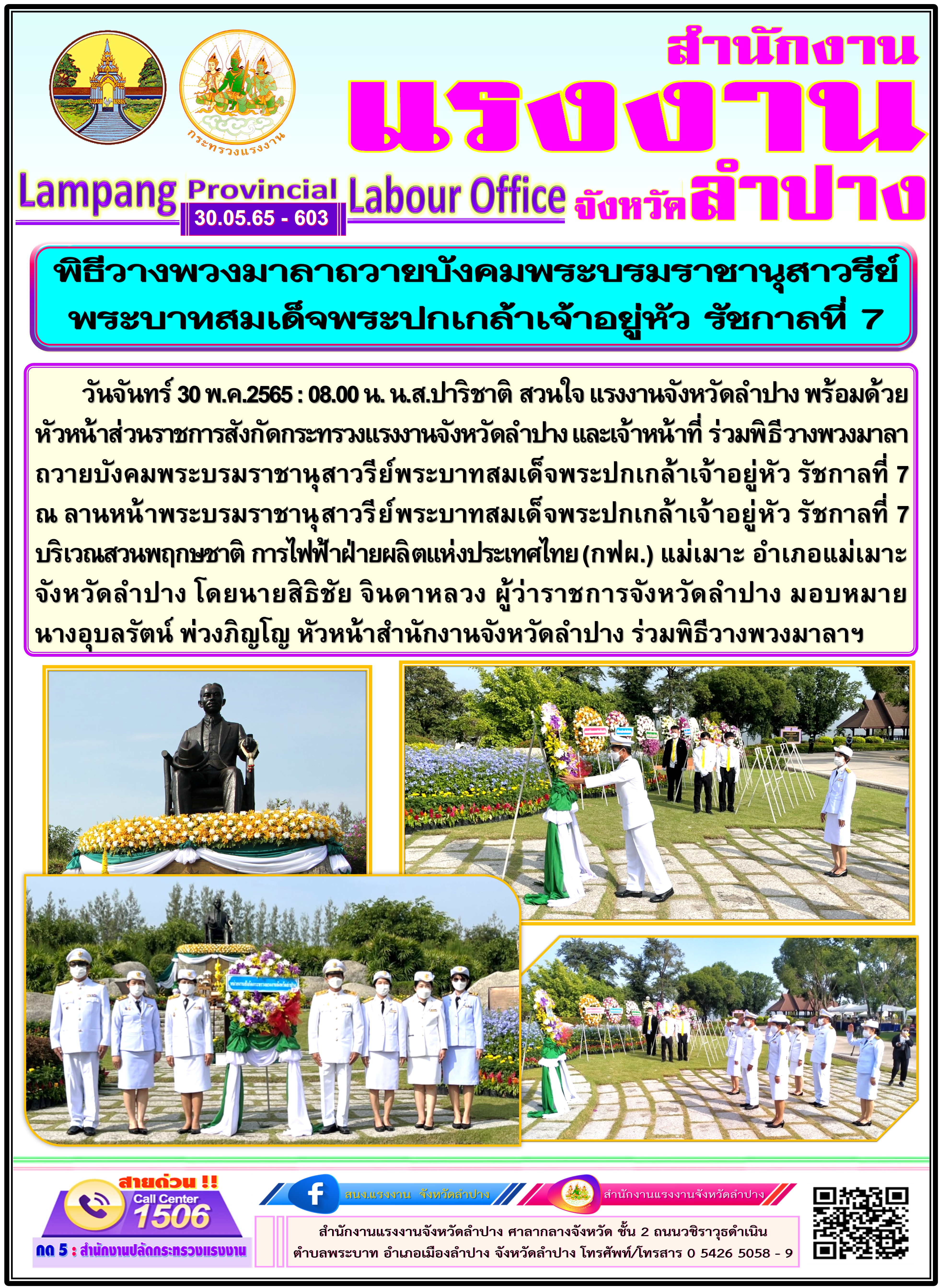 แรงงานจังหวัดลำปาง ร่วมพิธีวางพวงมาลาถวายบังคมพระบรมราชานุสาวรีย์พระบาทสมเด็จพระปกเกล้าเจ้าอยู่หัว รัชกาลที่ 7