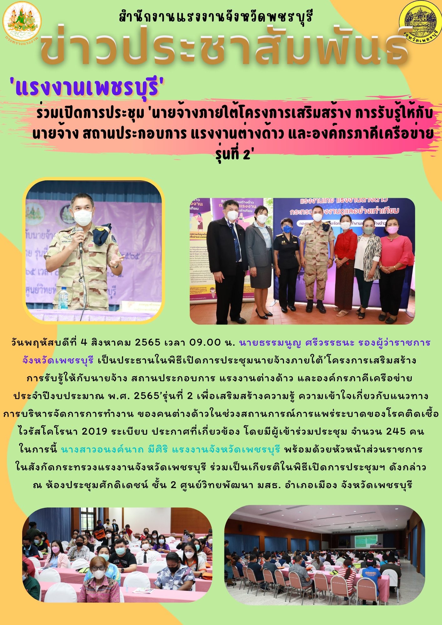 ‘แรงงานเพชรบุรี’ ร่วมเปิดการประชุม ‘นายจ้างภายใต้โครงการเสริมสร้าง การรับรู้ให้กับนายจ้าง สถานประกอบการ แรงงานต่างด้าว และองค์กรภาคีเครือข่าย รุ่นที่ 2’