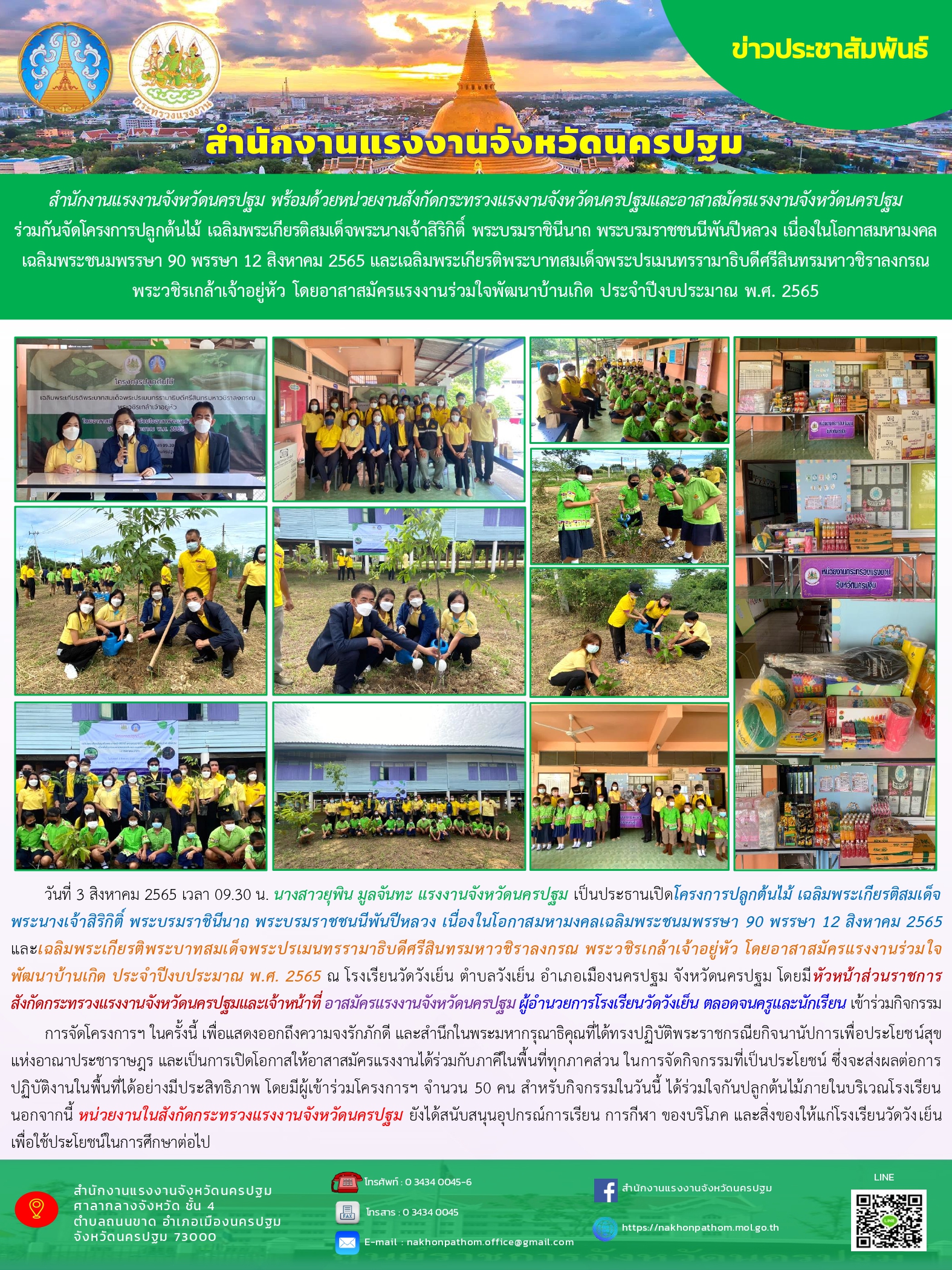 สำนักงานแรงงานจังหวัดนครปฐม พร้อมด้วยหน่วยงานสังกัดกระทรวงแรงงานจังหวัดนครปฐมและอาสาสมัครแรงงานจังหวัดนครปฐม ร่วมกันจัดโครงการปลูกต้นไม้ เฉลิมพระเกียรติสมเด็จพระนางเจ้าสิริกิติ์ พระบรมราชินีนาถ พระบรมราชชนนีพันปีหลวง