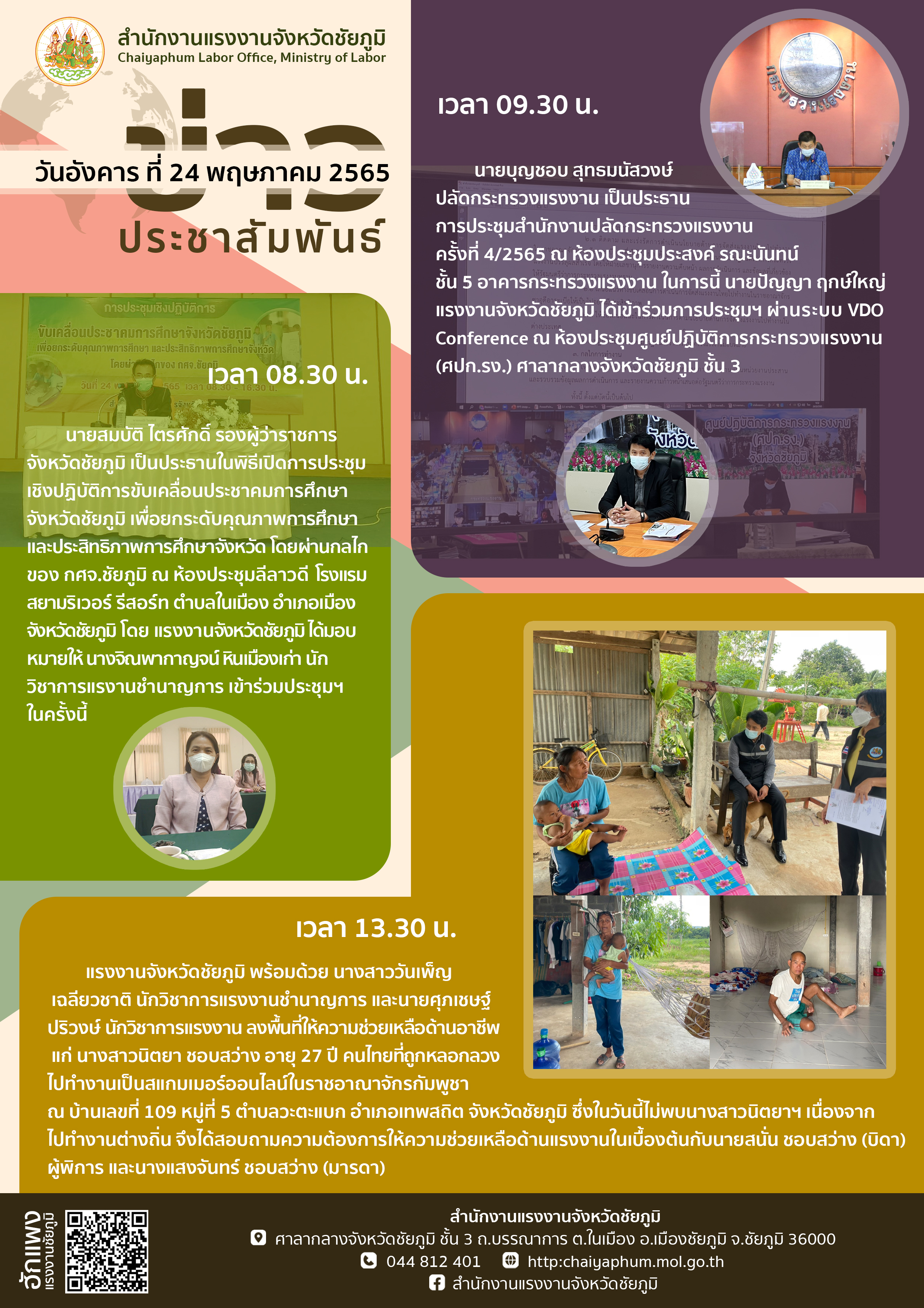 ข่าวประชาสัมพันธ์ของสำนักงานแรงงานจังหวัด ประจำวันอังคารที่ 24 พฤษภาคม 2565