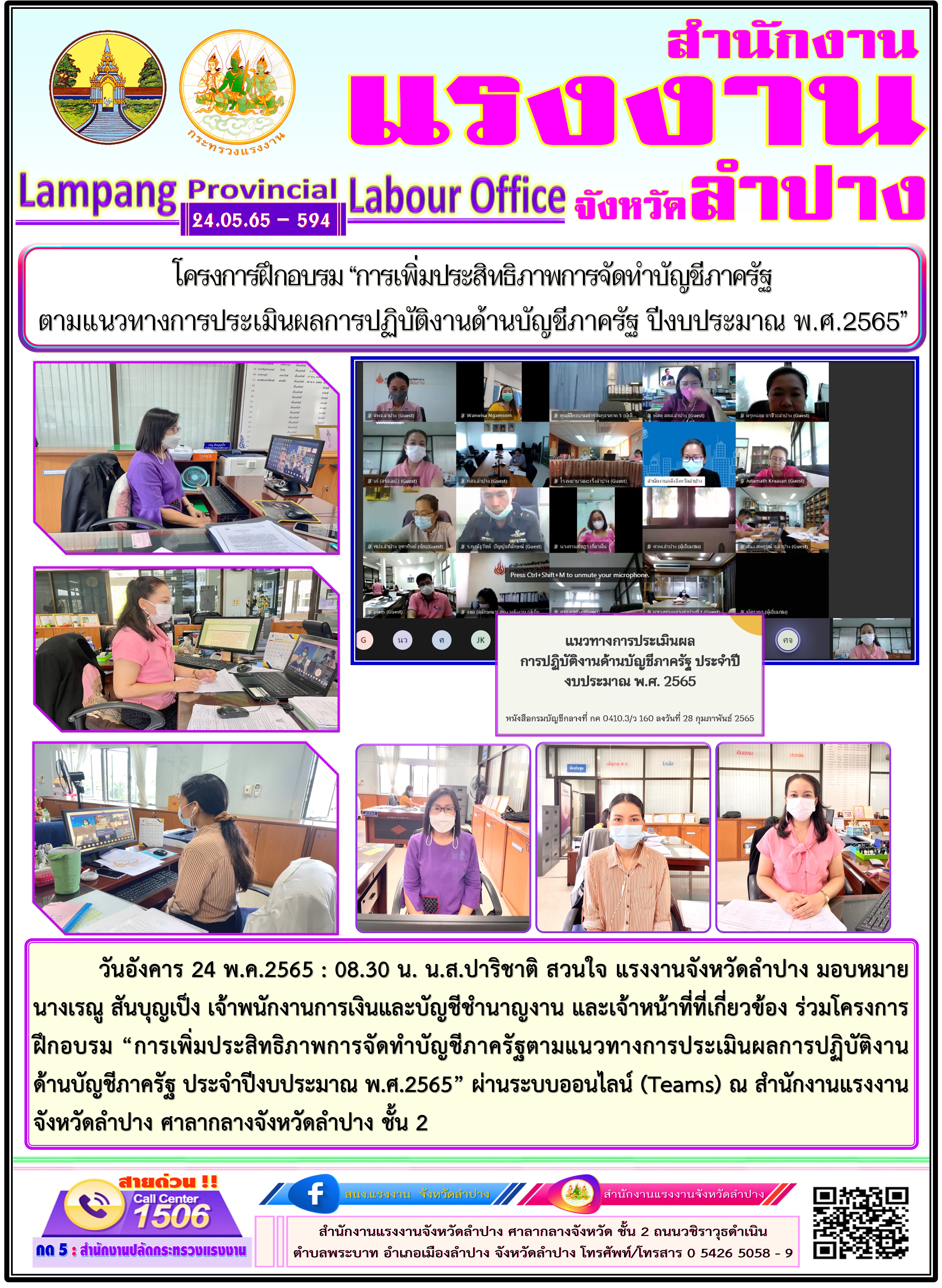 สรจ.ลำปาง ร่วมโครงการฝึกอบรม “การเพิ่มประสิทธิภาพการจัดทำบัญชีภาครัฐตามแนวทางการประเมินผลการปฏิบัติงานด้านบัญชีภาครัฐ ประจำปีงบประมาณ พ.ศ.2565” ผ่านระบบออนไลน์ (Teams)