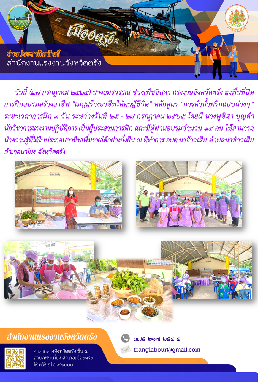 แรงงานจังหวัดตรัง ลงพื้นที่ปิดการฝึกอบรมสร้างอาชีพ “เมนูสร้างอาชีพให้คนสู้ชีวิต” หลักสูตร “การทำน้ำพริกแบบต่างๆ” ณ ที่ทำการ อบต.นาข้าวเสีย